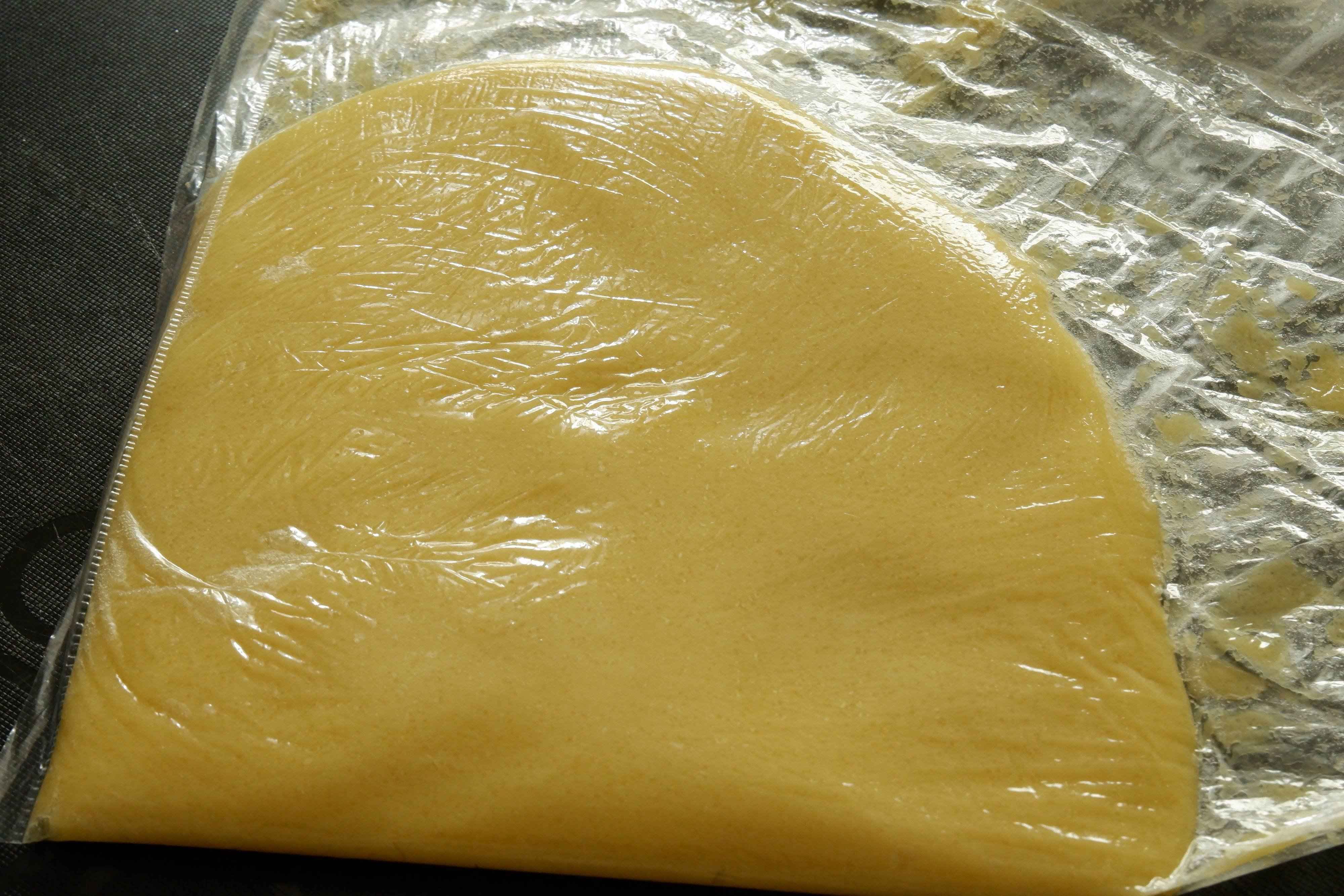 3.袋のまま麺棒でのばしていきます。今回は5mmほどの厚さに。