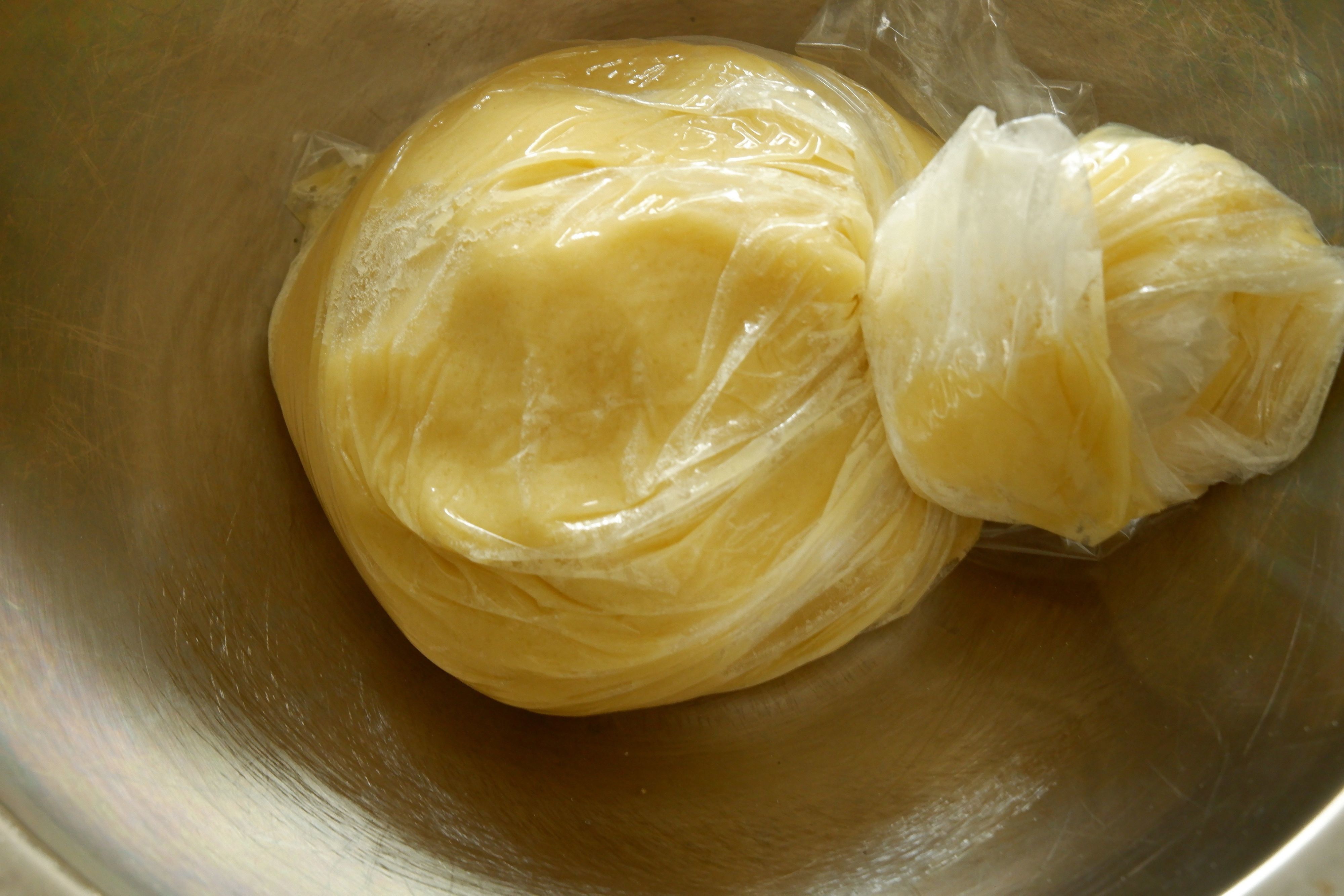 2.オリーブオイルを入れ揉み、生地がまとまったら口を縛り、冷蔵庫で15分休ませる。