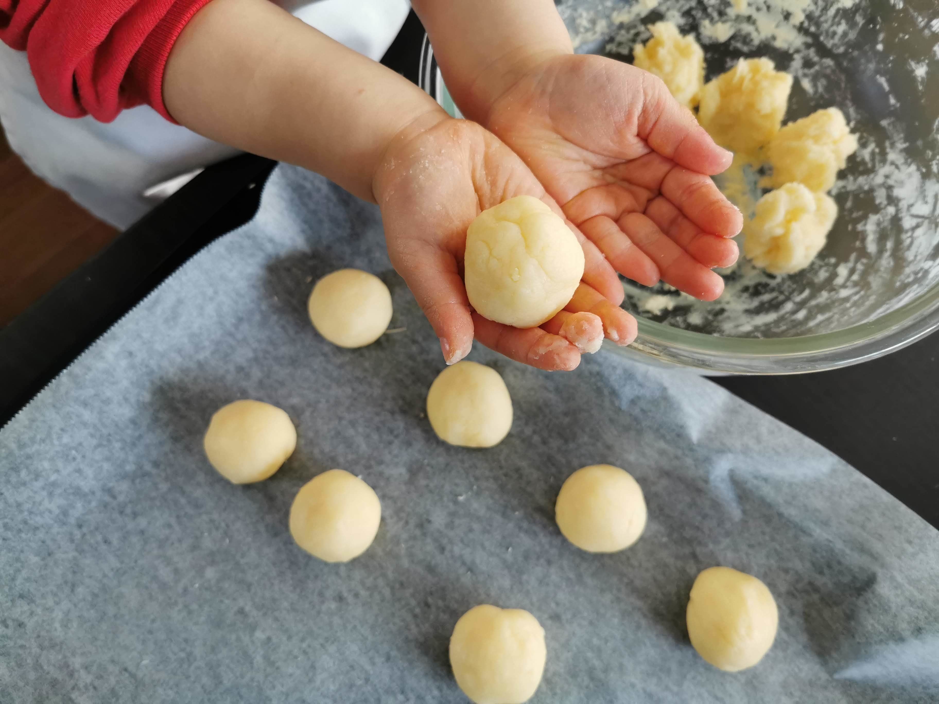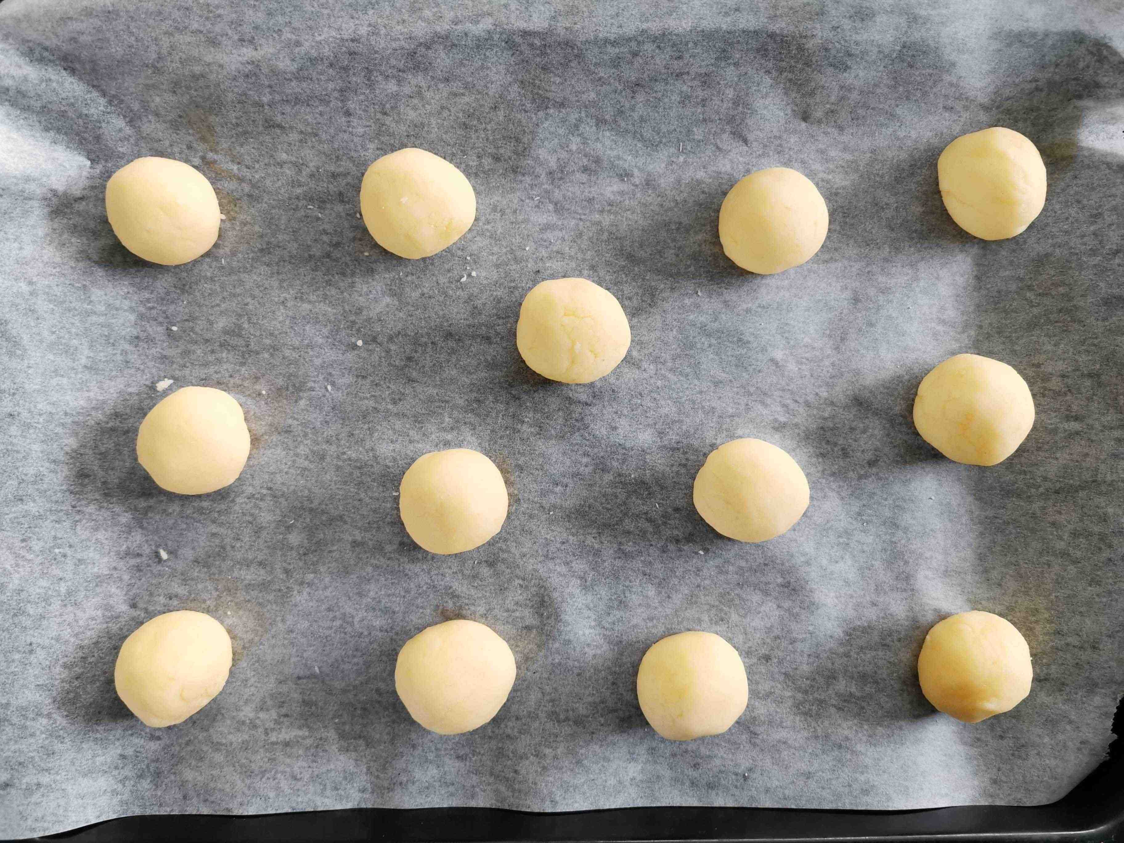3:2に卵と水小さじ1、粉チーズを加えてよく混ぜ合わせ、小さめの大きさに丸めて天板に並べる。