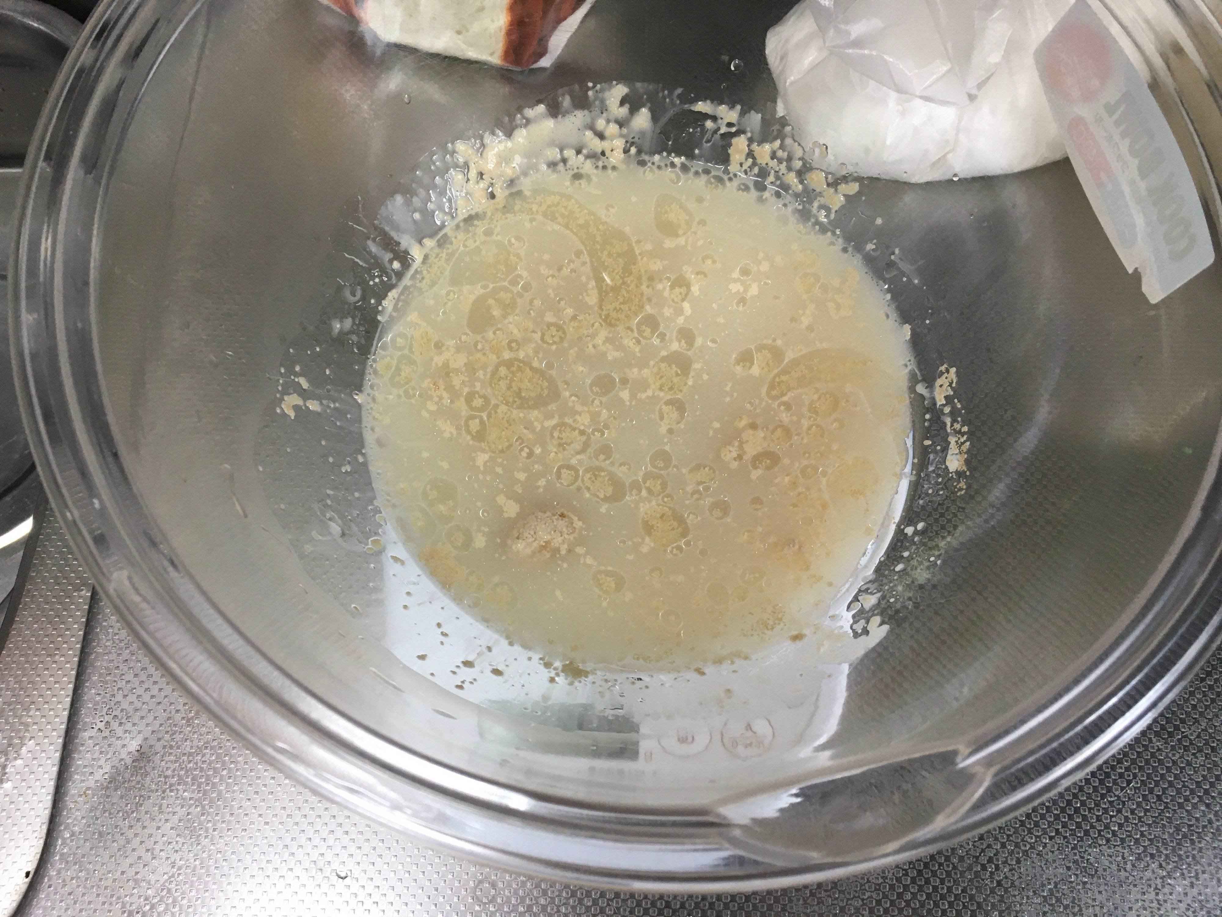 (2)砂糖とドライイーストを加えて、軽く混ぜる。