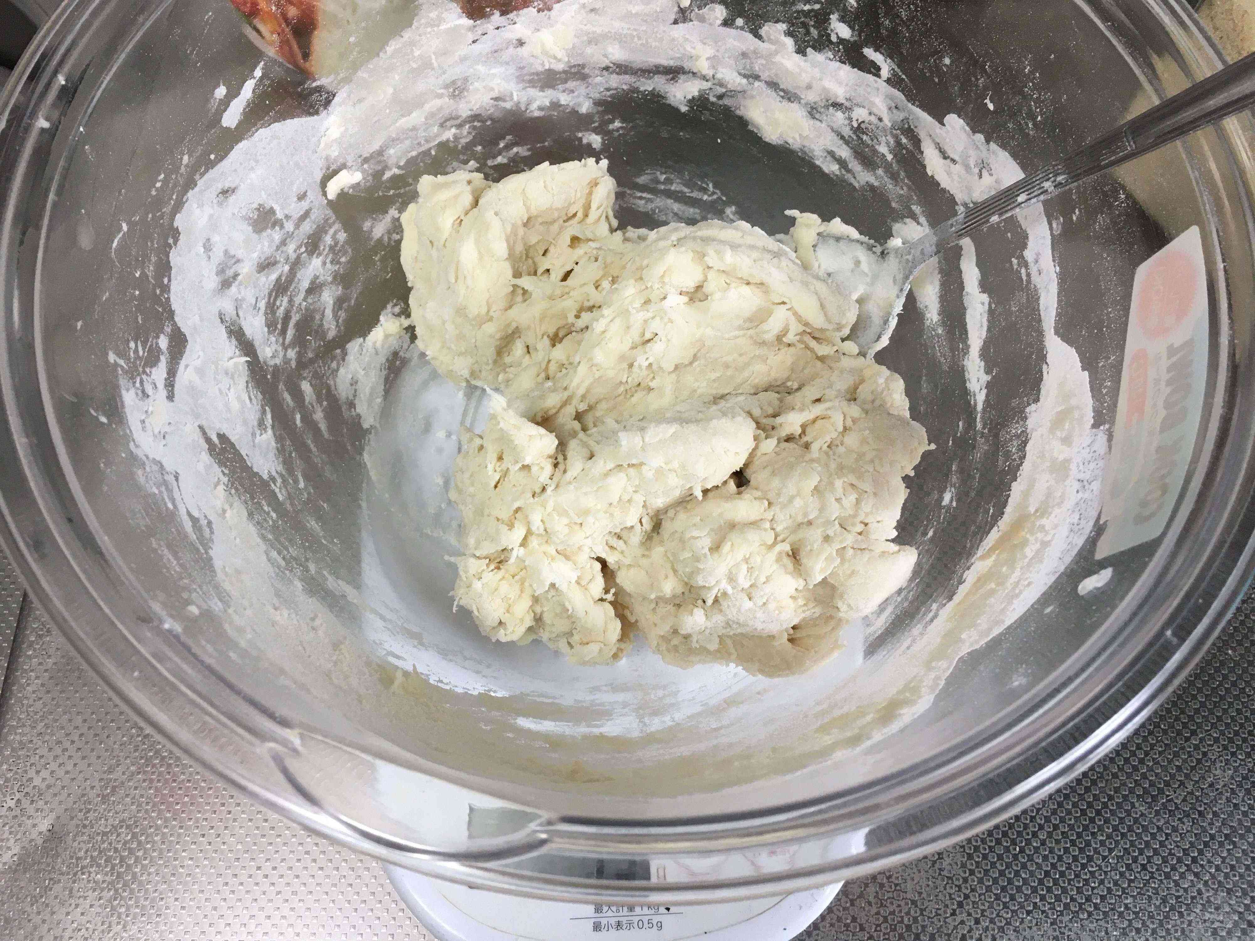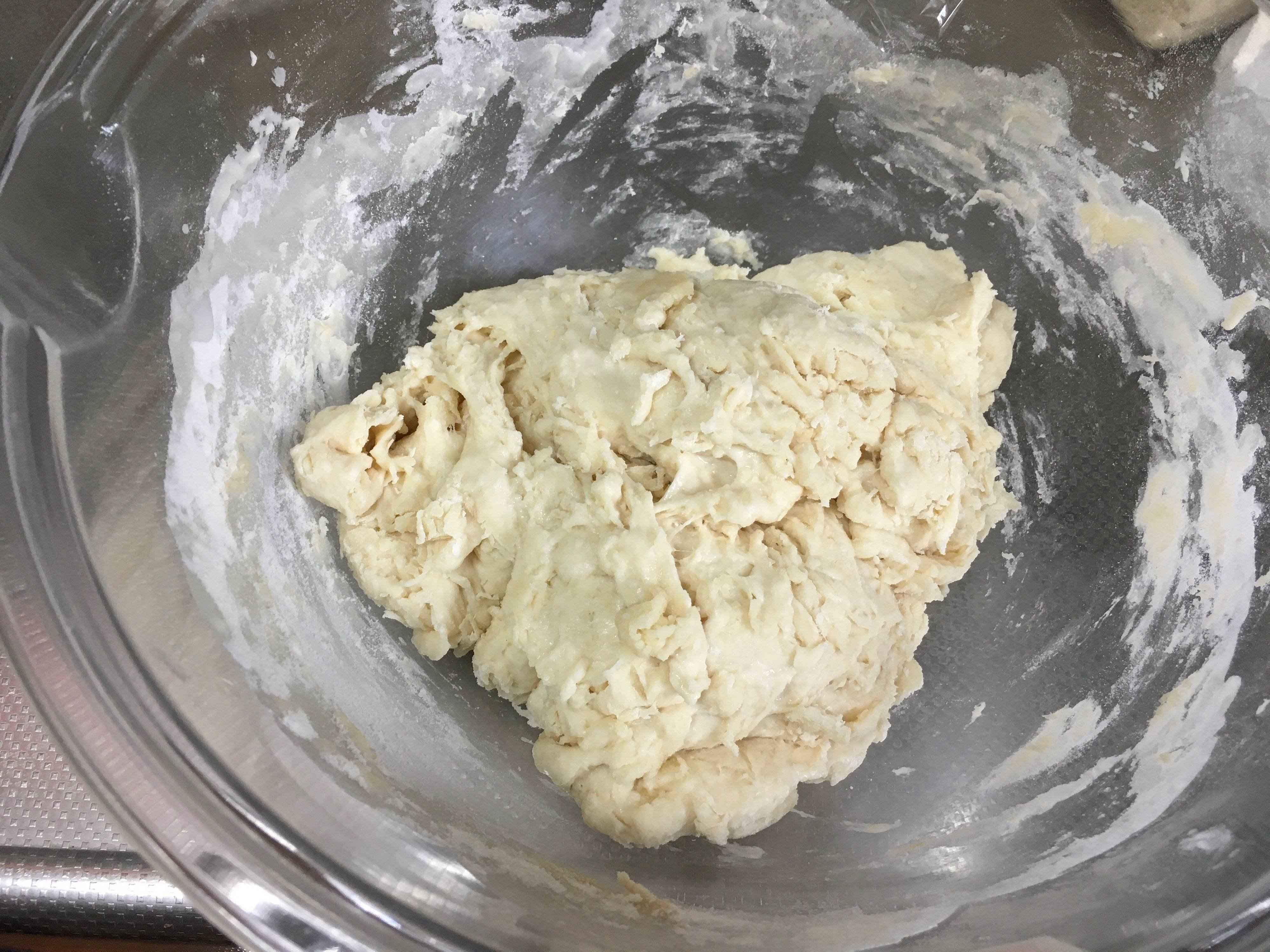 (4)残りの強力粉と、塩を加えて、ひとかたまりになるまで混ぜる。