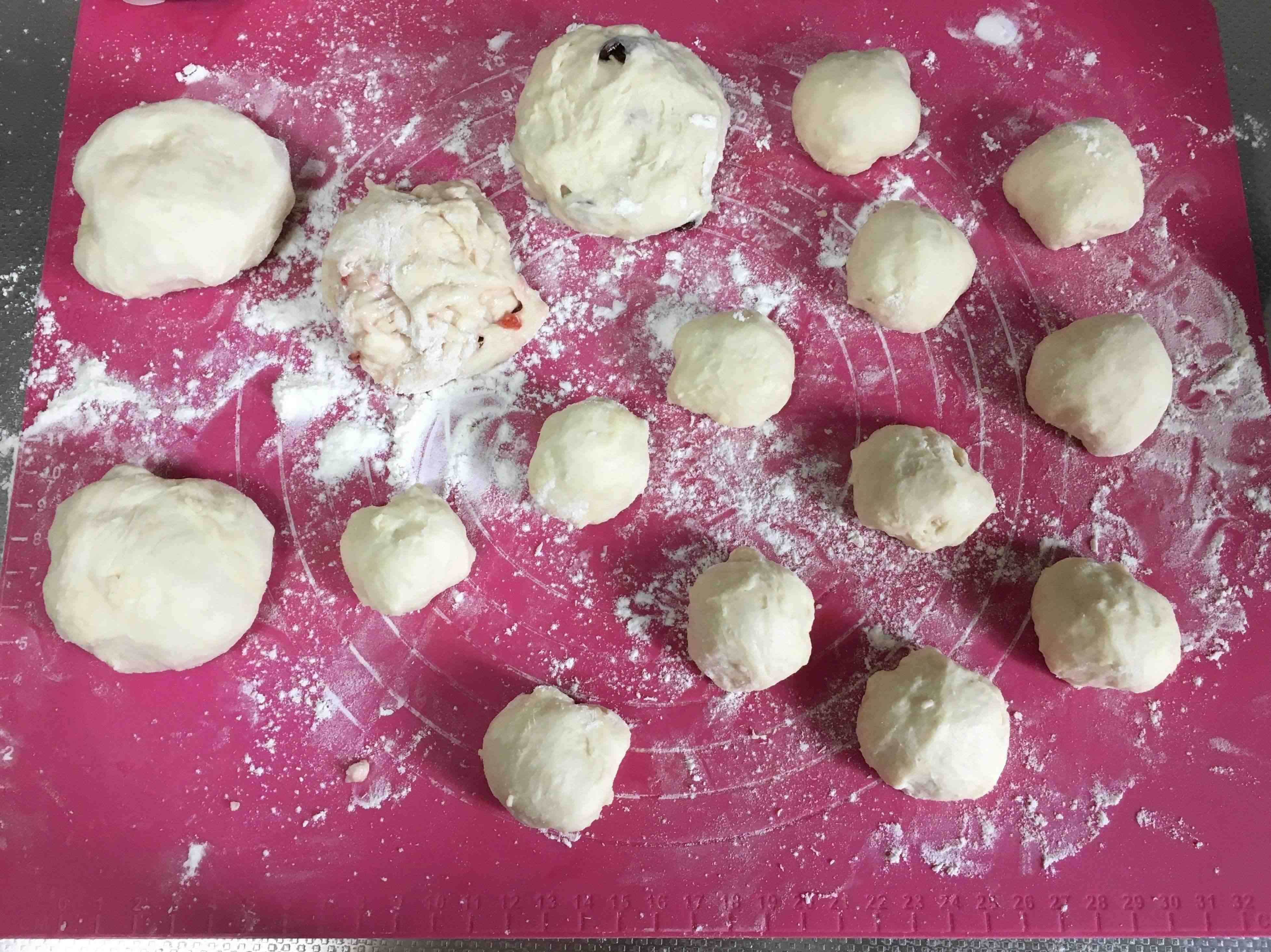 (6)打ち粉をした台に乗せ、スキッパーで成形するサイズにする。具材を混ぜ合わせるならここで入れる。丸く成形したら、とじ目を下にする。