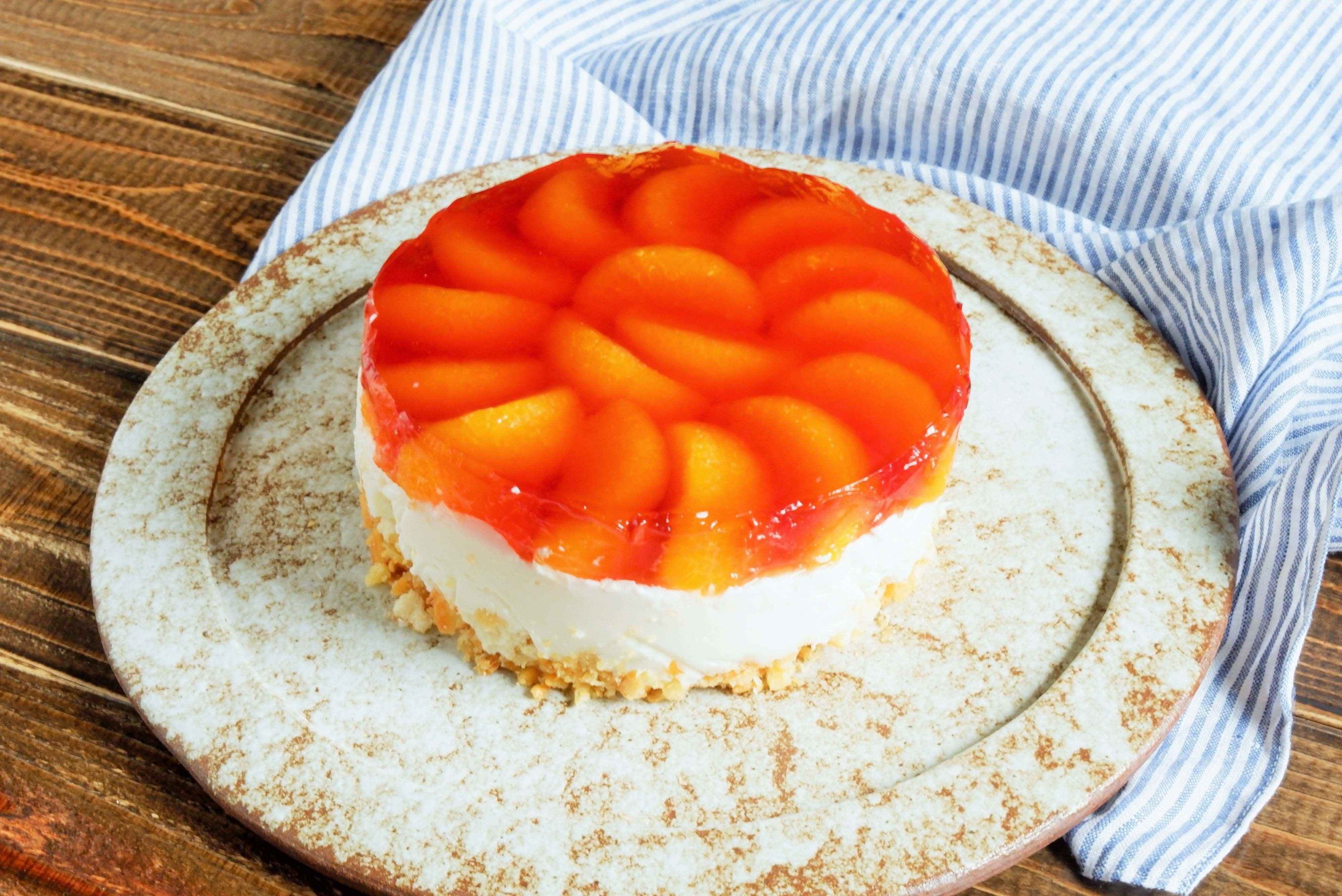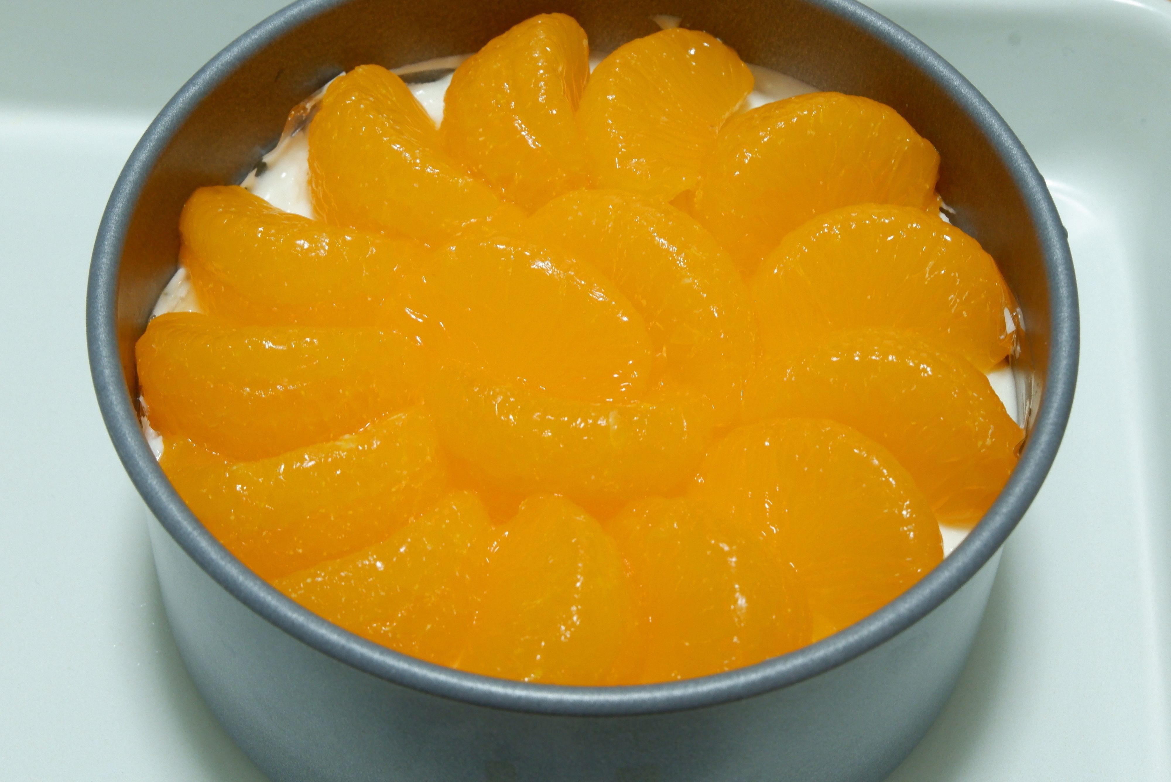 5.3の上に汁を切ったみかんの缶詰を並べ、その上に4をゆっくり流し入れる。
