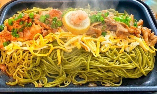 5.ホットプレートにごま油(分量外)を引き、1の茶そば、3の卵、2の牛肉、4のねぎの順で盛りつける。