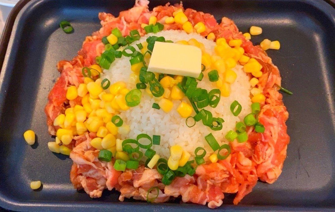 3.ホットプレートに1のご飯と、2の牛肉、コーン、小ネギ、バターを盛りつける。