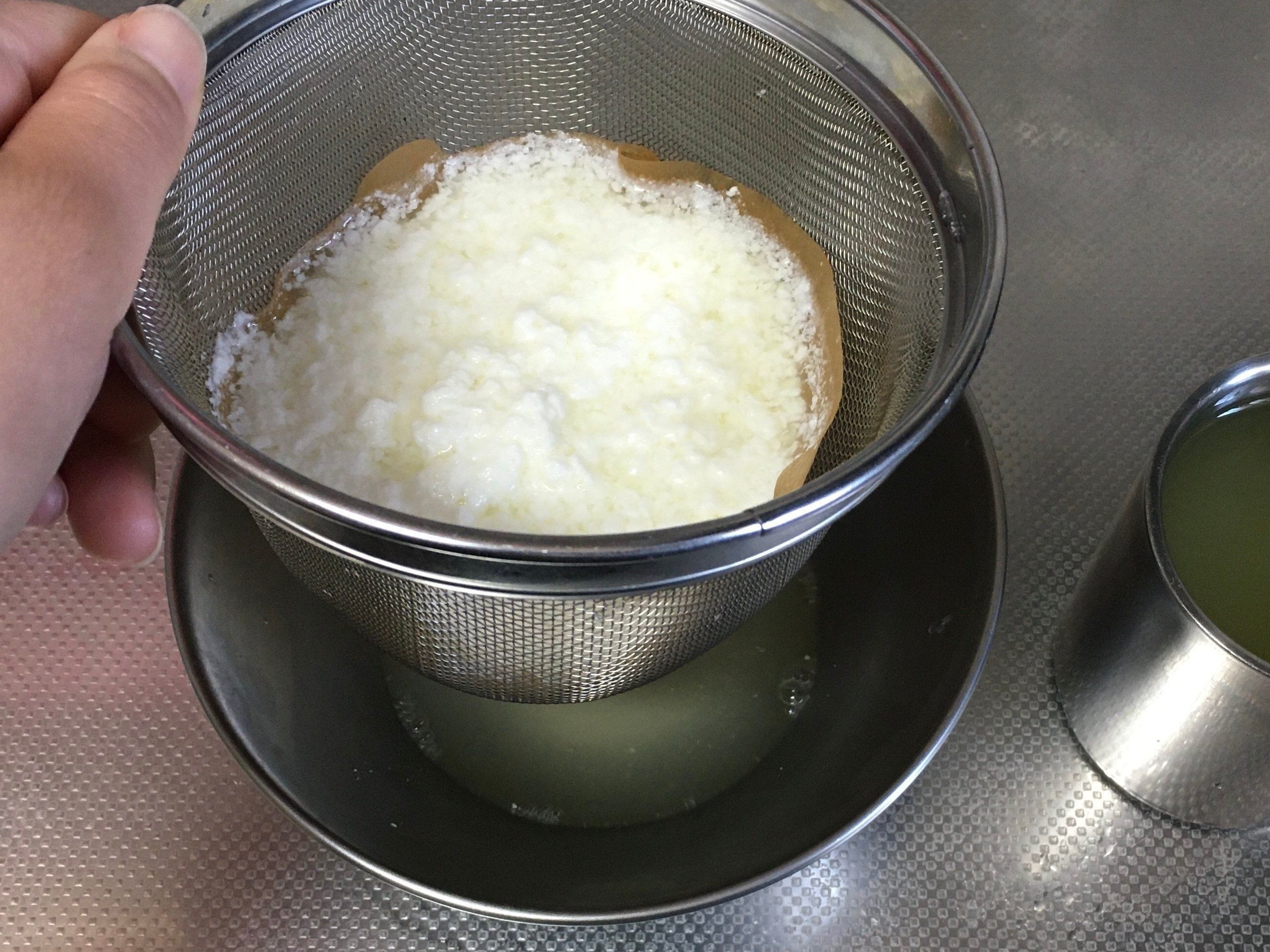 1.ボウルに、網目のこまかいザルを入れて、キッチンペーパーやさらしで水気を切る準備しておく。