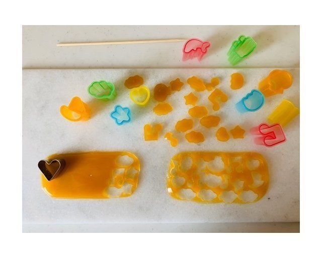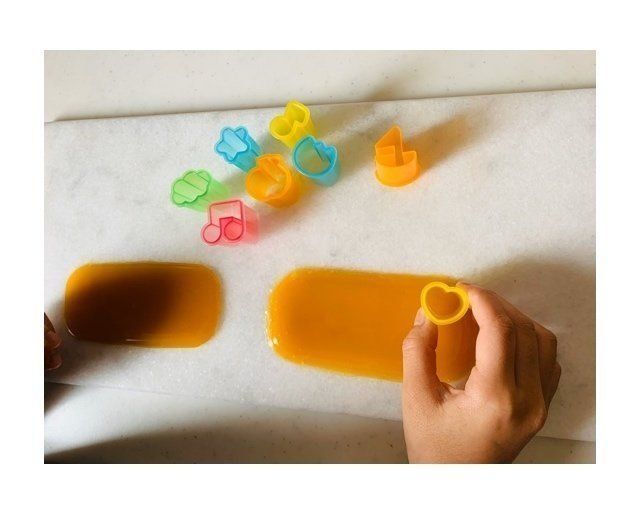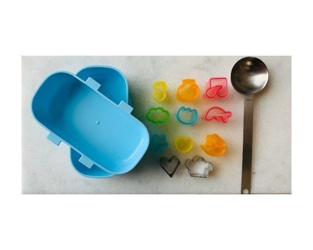 グミをつくる型は、お弁当箱などグミ液が平らになる容器をご用意ください。ほかに、キャラ弁などで使う型、クッキー型もあれば楽しいですね。砂糖を計る大さじスプーンも用意しましょう。なければ、砂糖は30g用意します。