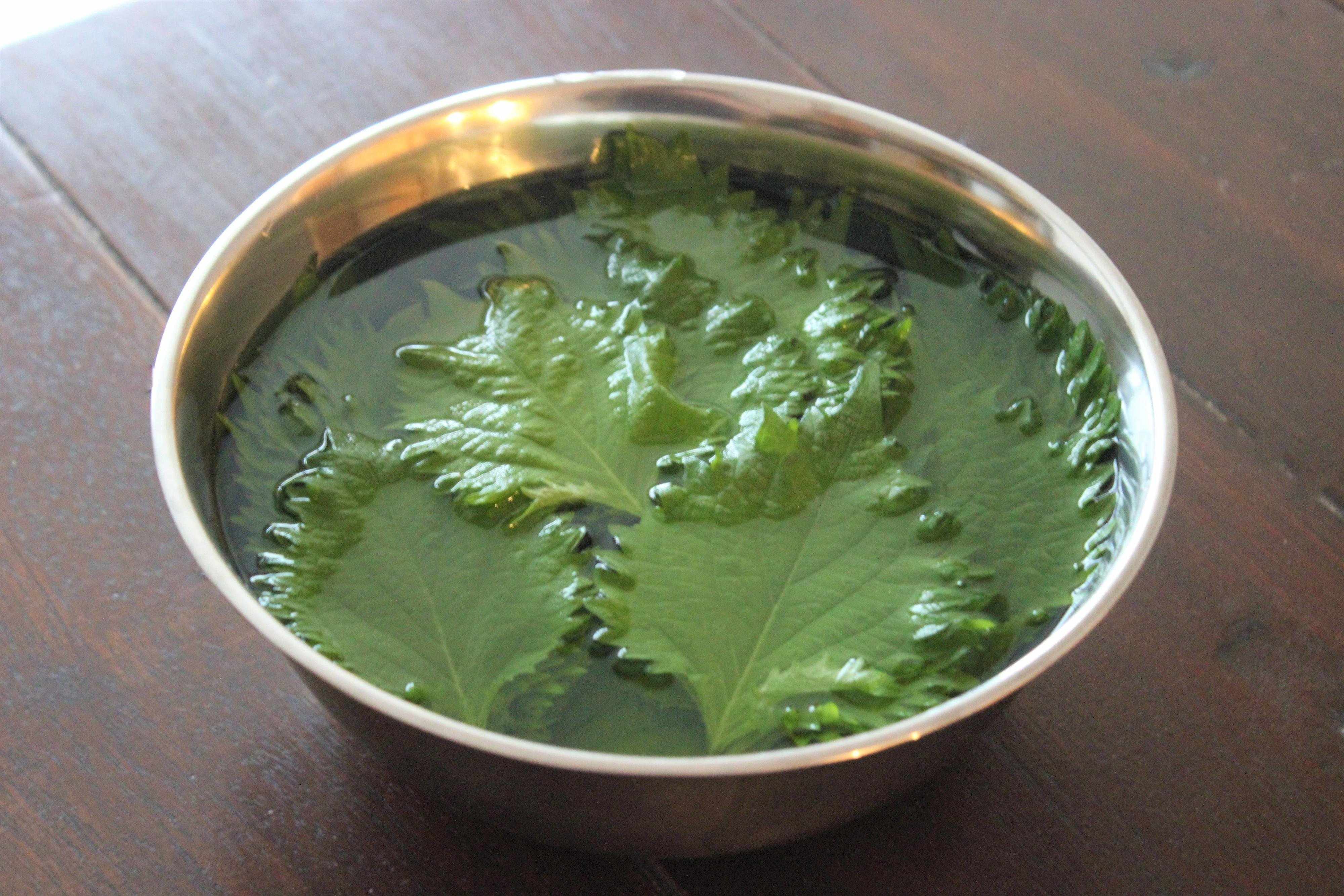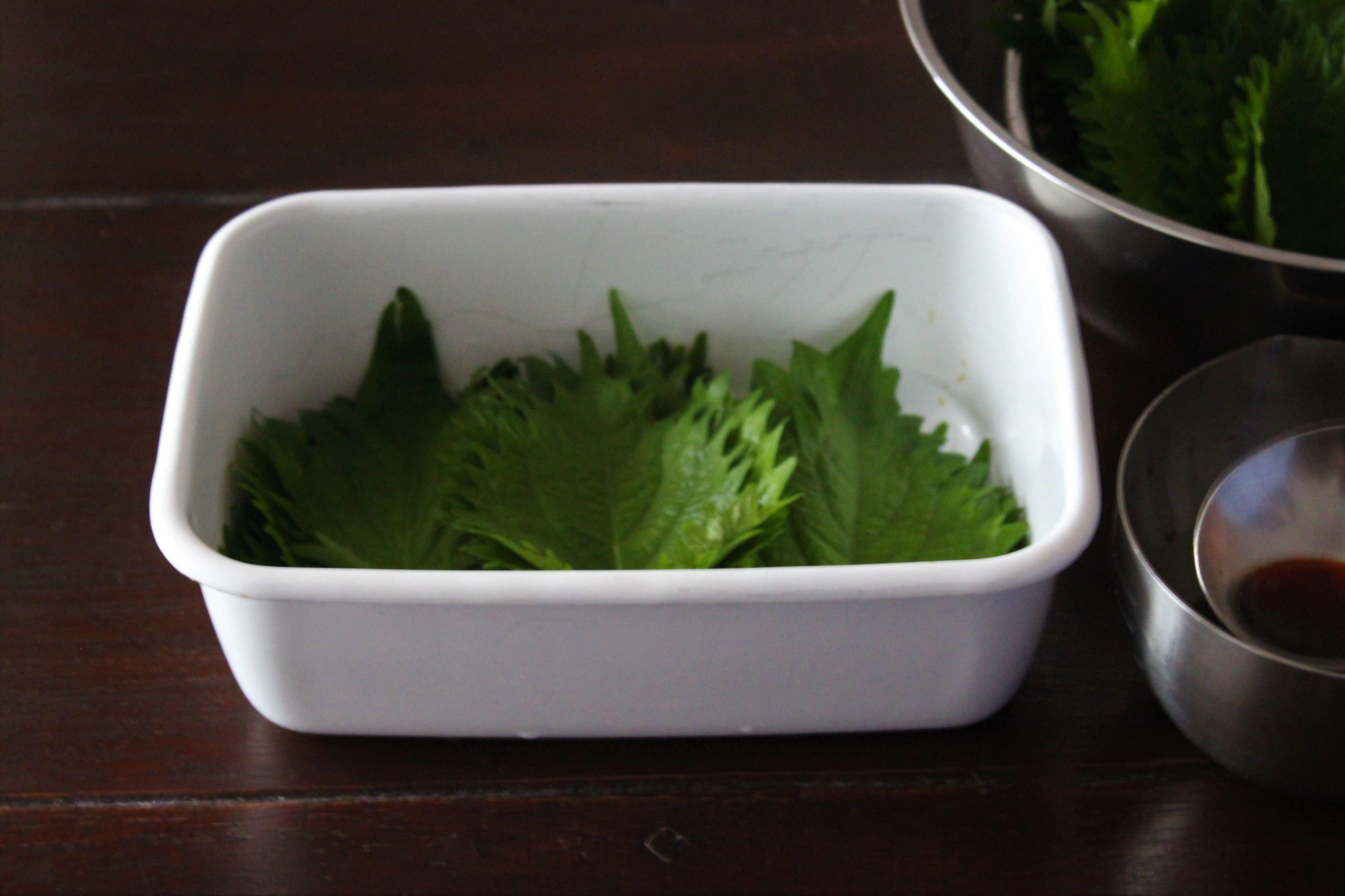 2.大葉は葉元の茎を切りおとし、3%程度の塩水に5~10分つけて水気を切ります。