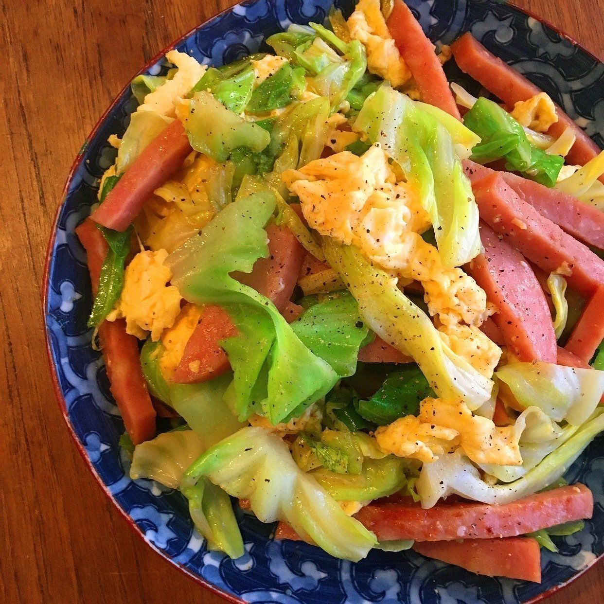 【炒める】春キャベツと厚切りハムと卵の炒め物