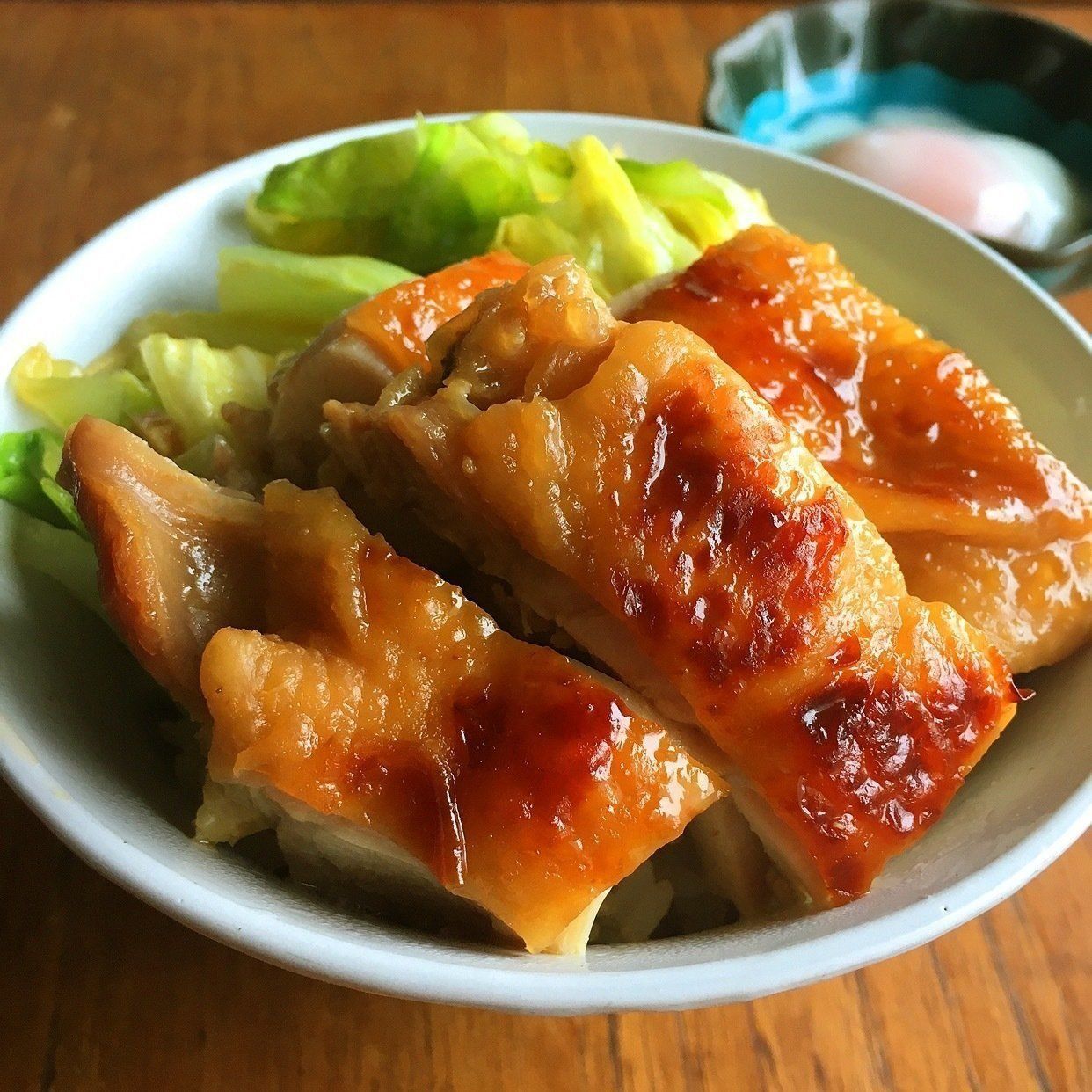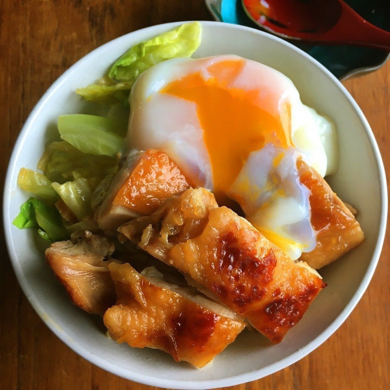 白ごはんに残った煮汁を回しかけ、春キャベツをのせ、その上に適当な大きさにカットした鶏もも肉を盛りつける。