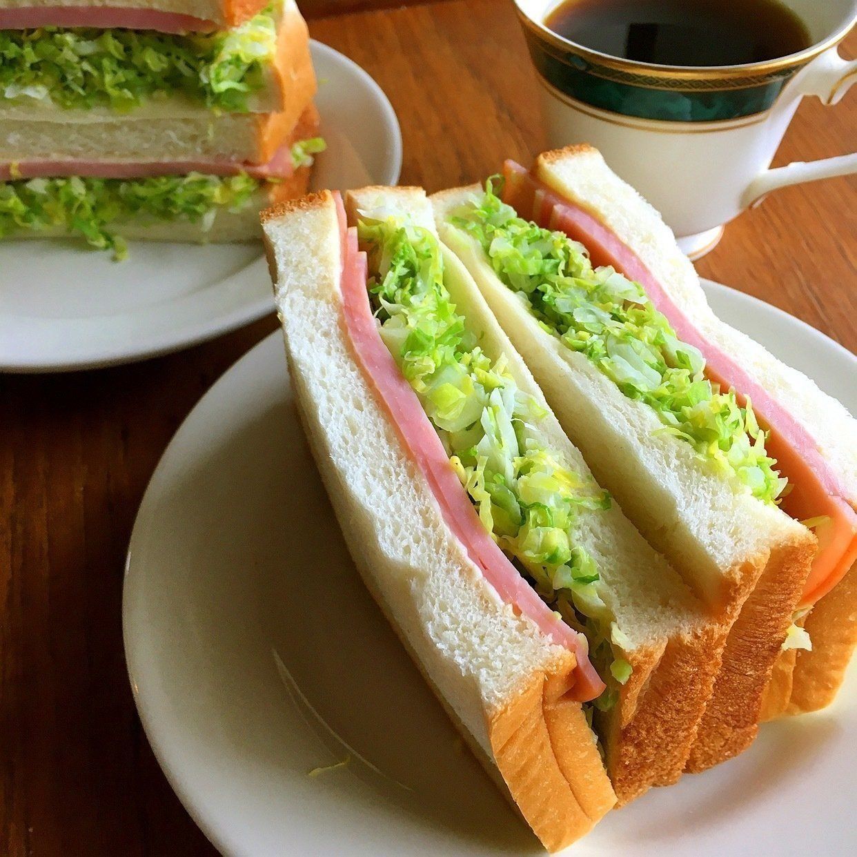 3.食パンにからしマヨネーズを塗り、水気をしぼった2のキャベツとハムをはさんだらできあがりです。