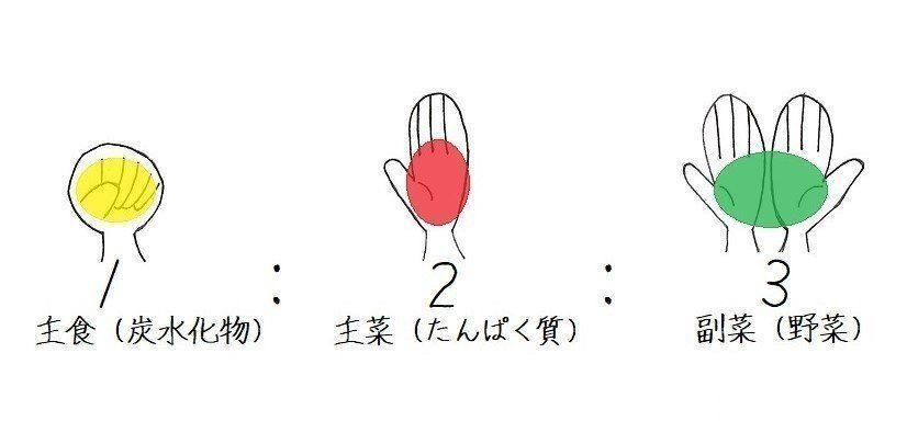 このバランスを意識して、その範囲内で好きなものを食べます。目安は、お肉(たんぱく質)は「手のひら分くらい」、主食はたんぱく質の半分、副菜はたんぱく質の倍です。