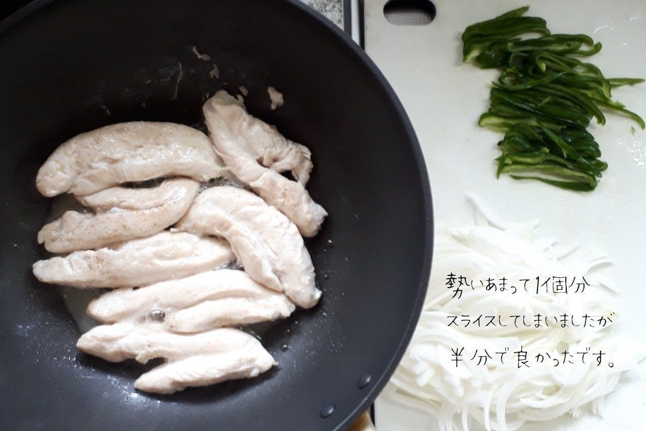 蒸している間に、玉ねぎとピーマンを切っておきます。