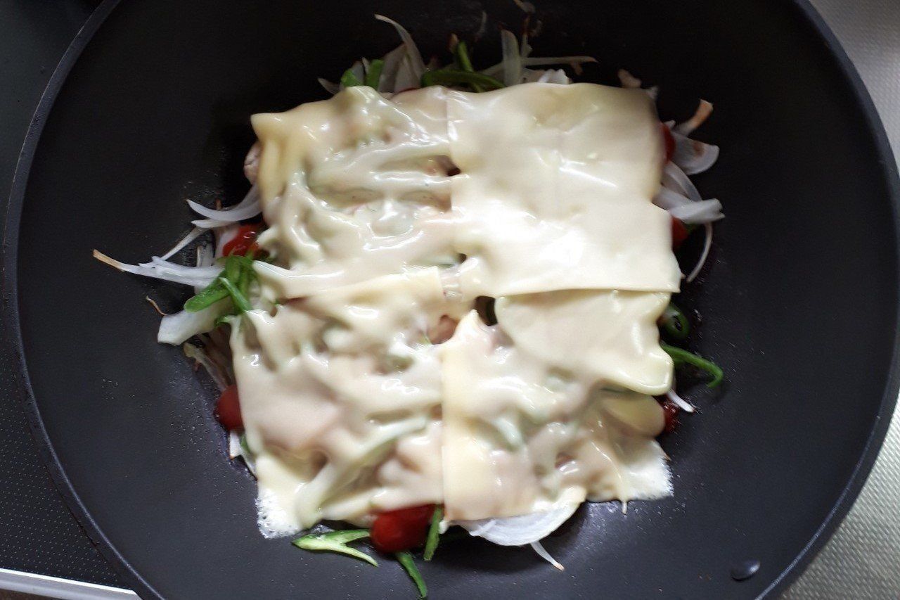 たまねぎが透き通ったら、とろけるチーズをのせて、水分が飛ぶまで焼けばできあがりです。