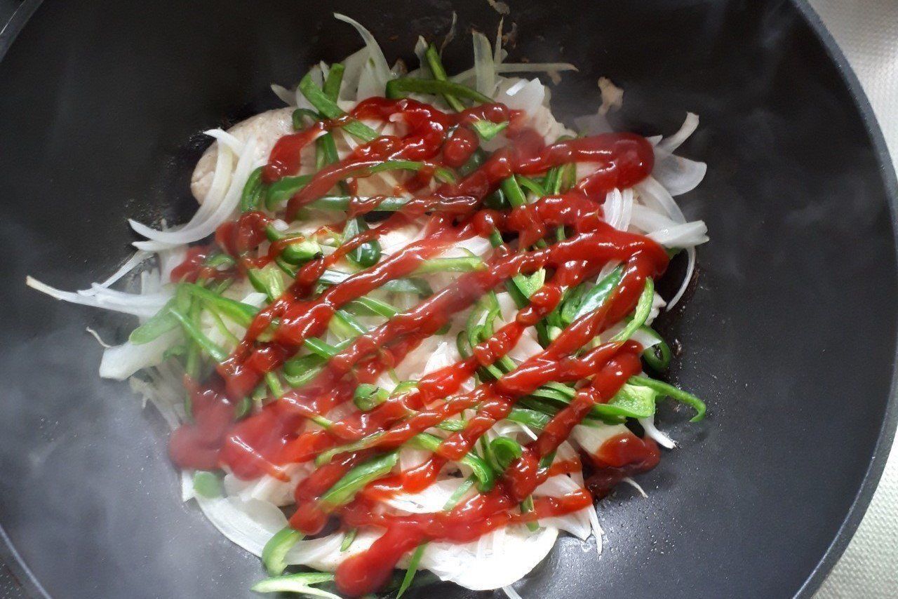 ささ身が蒸しあがりましたら、ピーマンと玉ねぎをこんもりと乗せまして、ケチャップをかけます。
