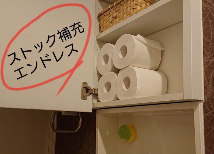 トイレットペーパーのストックをトイレの棚に補充する作業。(付け替えは元々家族の仕事)