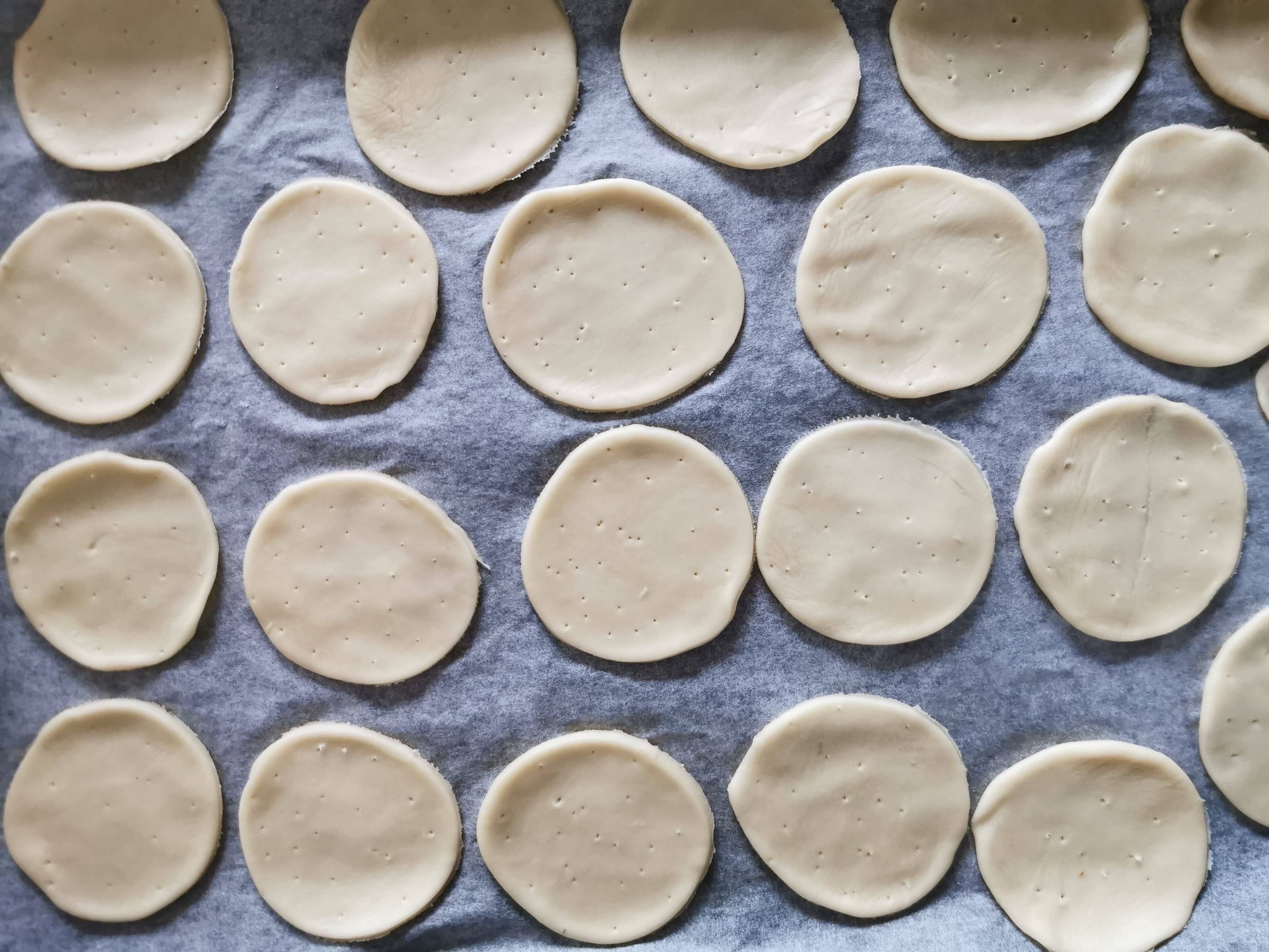 (2)1を薄くのばし、好きな型でくりぬき、爪楊枝で数ヵ所穴を適当にあける。