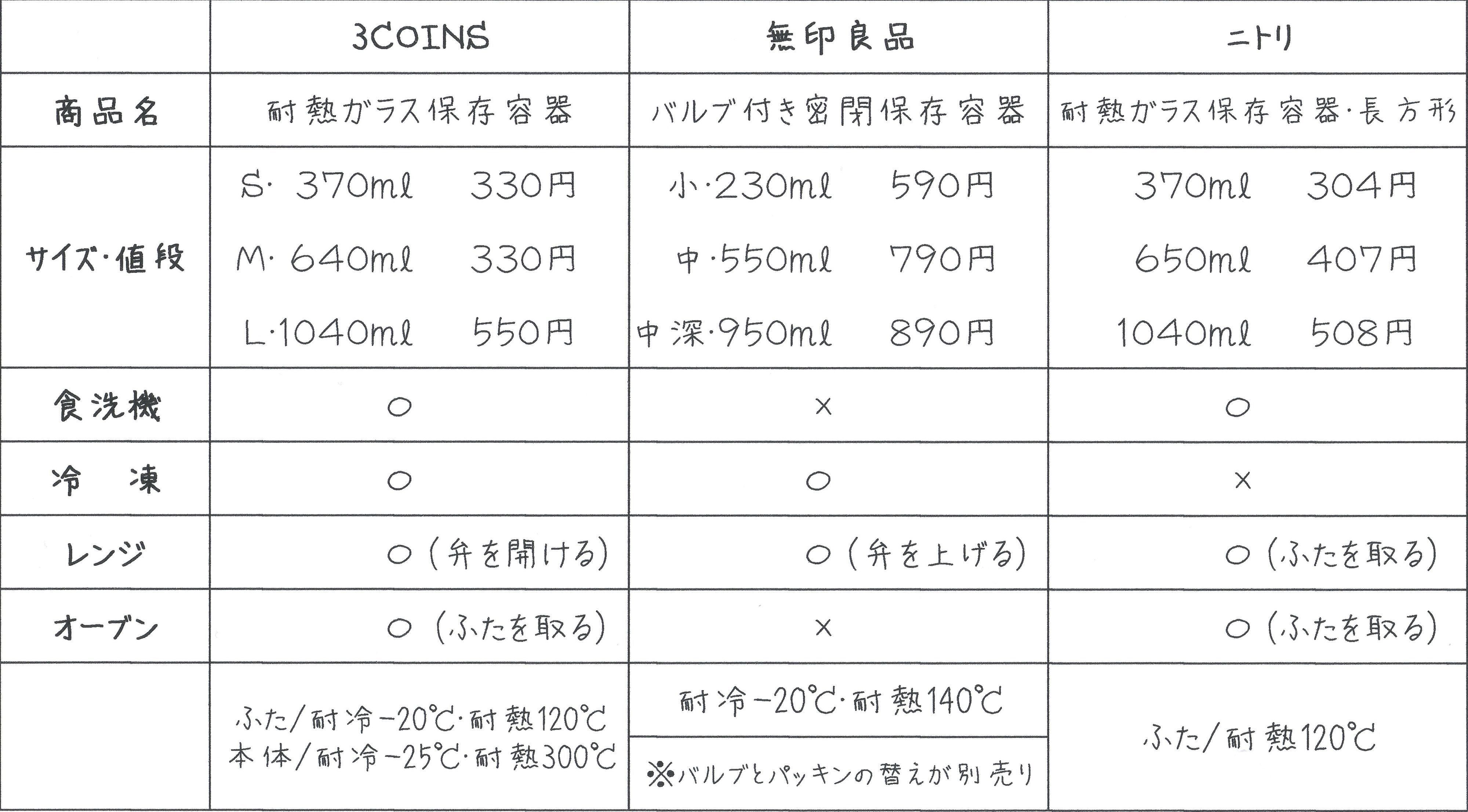 無印やニトリにも耐熱ガラス保存容器があるので、比較してみました。