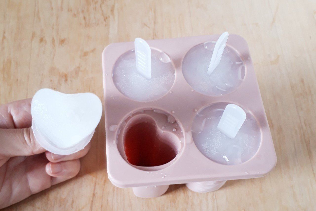 100均の商品は本体が固いプラスチック製なため、固まったジュースが出てこないで、芯だけ抜けてしまうことがあるのですが、こちらの商品はシリコン製なので、取り出しやすいです。