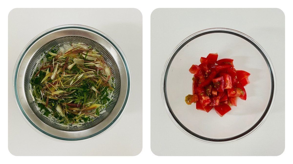 (4)フライパンに残った汁にトマトを入れ、ひと煮立ちさせてタレをつくる