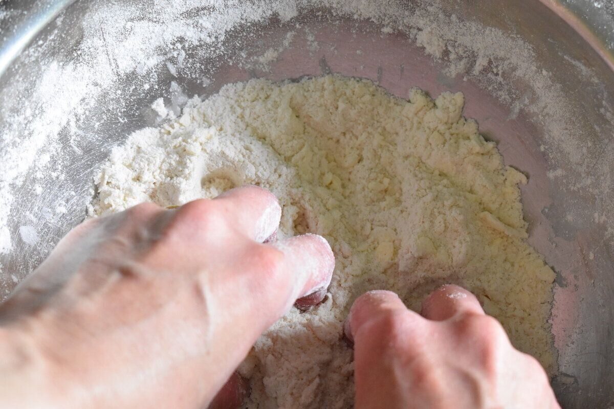よく洗ってしっかり拭いた指先で、バターと粉を混ぜていきます。私は手を冷たい水で冷やしながら(その都度よく拭いて)この作業をしています。