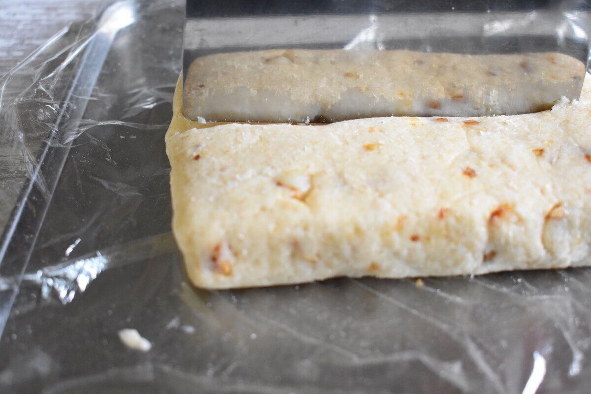 生地の厚さは2.5cm程度、カードや包丁でスパッと切ります。あまり生地を潰さないように、潔く一発で切ることできれいに焼けます。