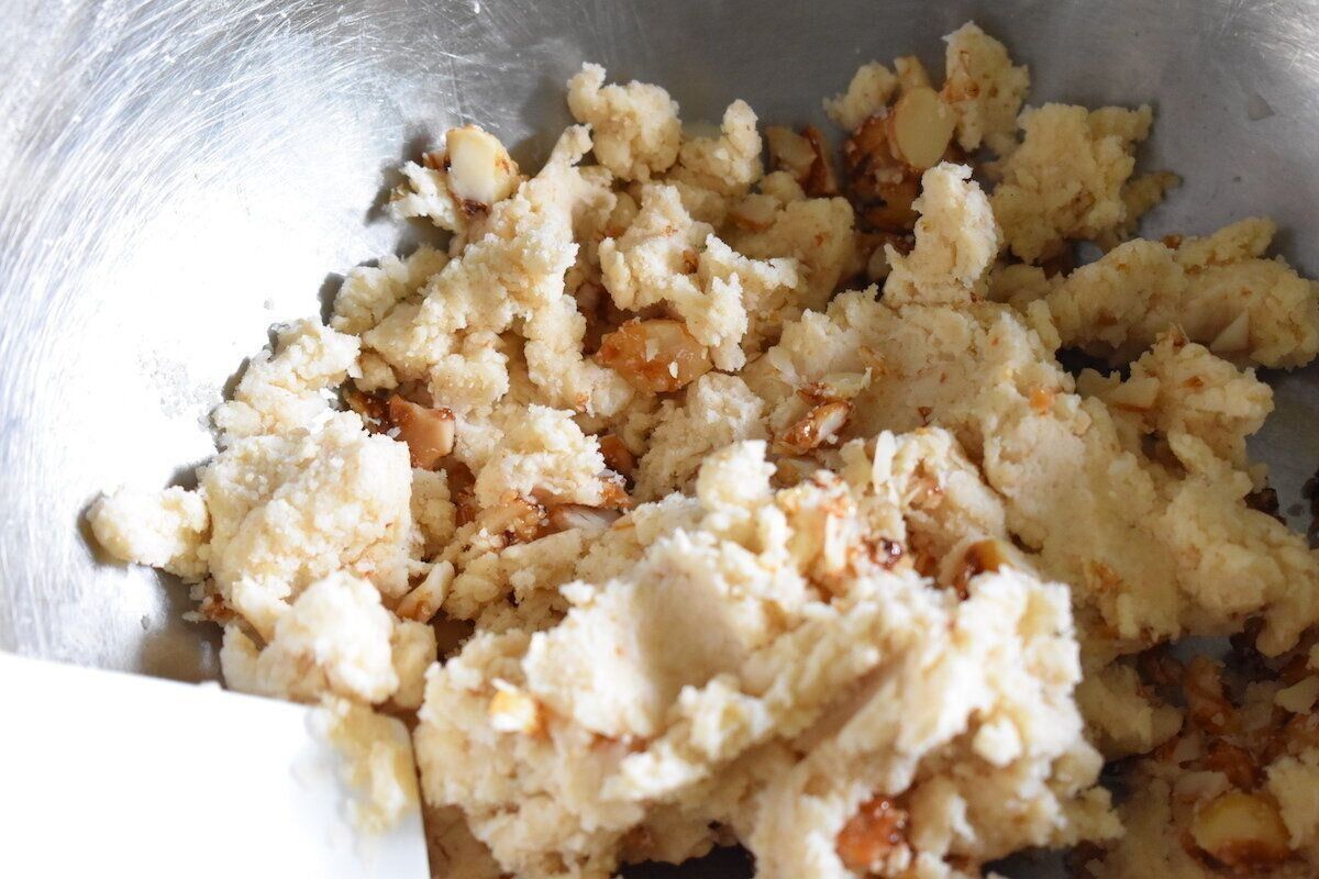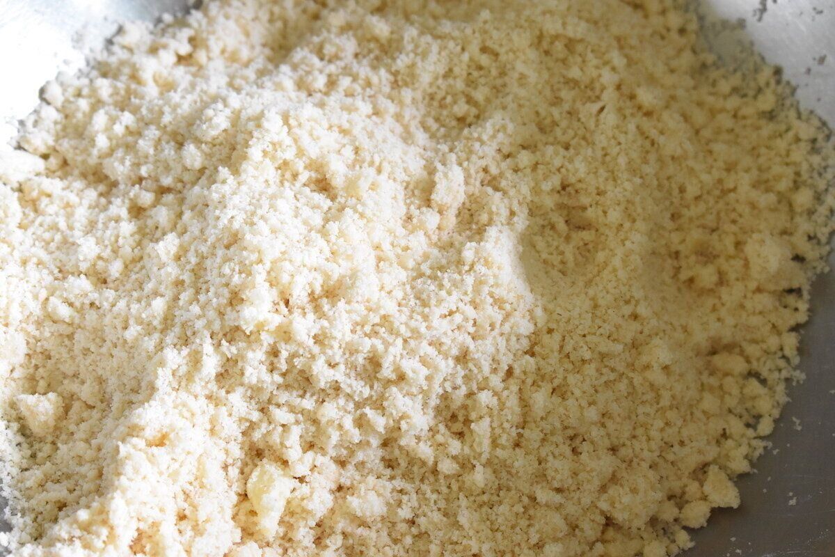 バターを溶かさないようにラブインすることで、食感がよく仕上がるので、もしパイ生地ブレンダー、カードがあれば、切るように混ぜてもよいです。