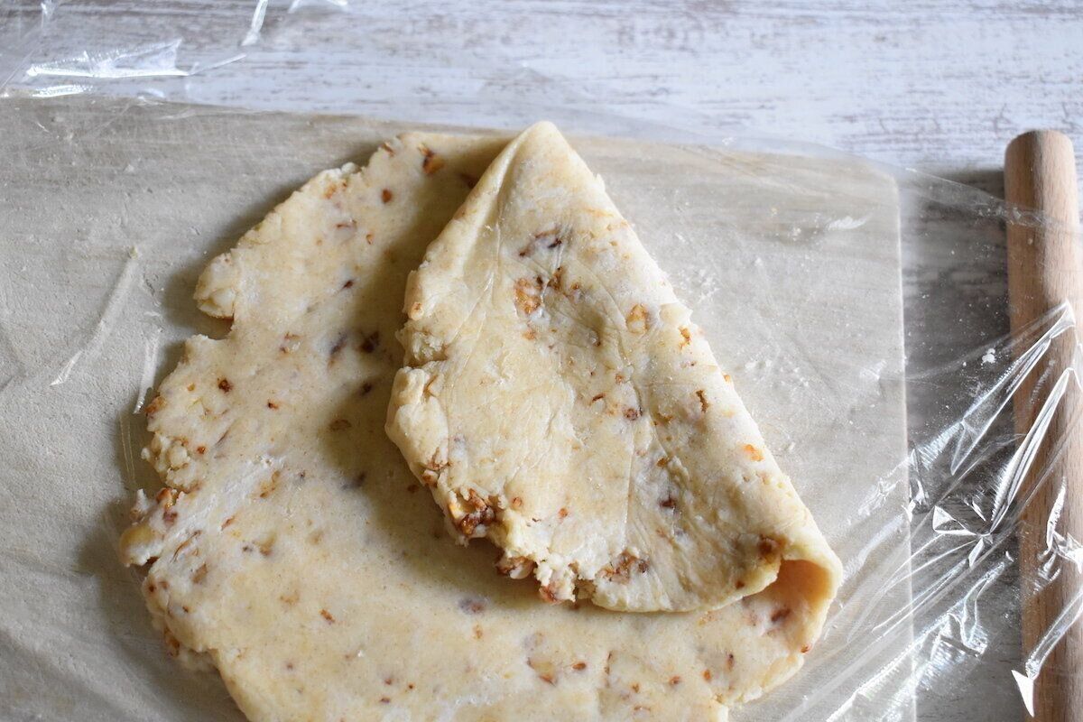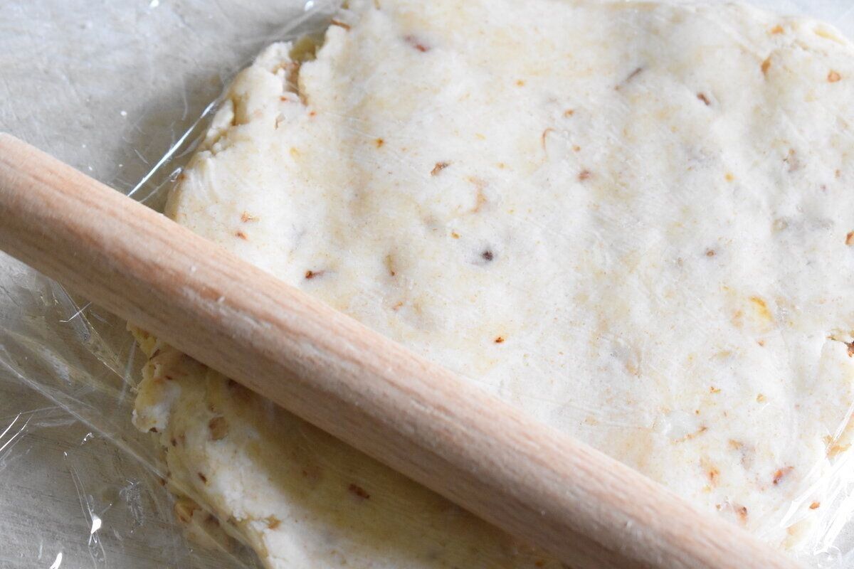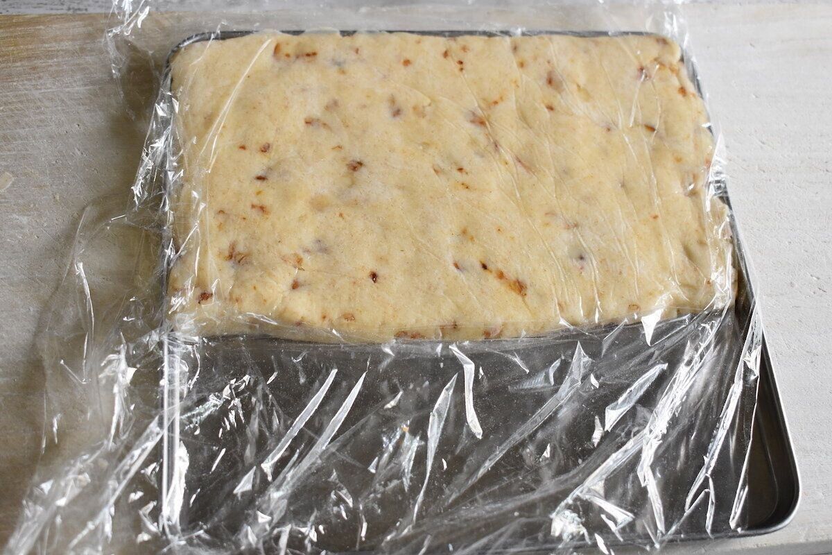 再び3つ折りにして、ラップで覆い、冷蔵庫で生地をねかせます。生地を冷やすことで、食感よく仕上げます。