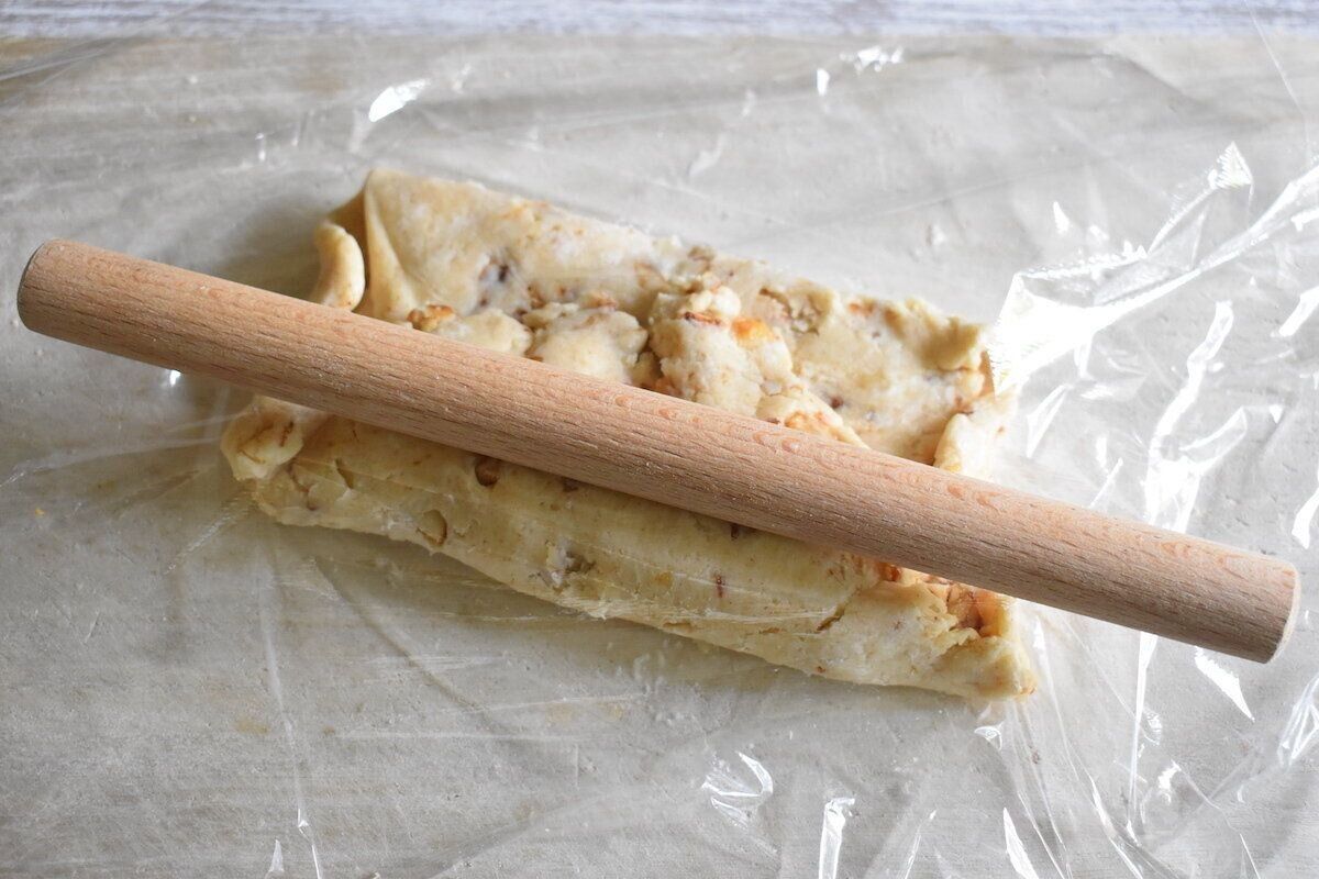 2枚のラップで挟み、麺棒で均一の厚さに伸ばします。