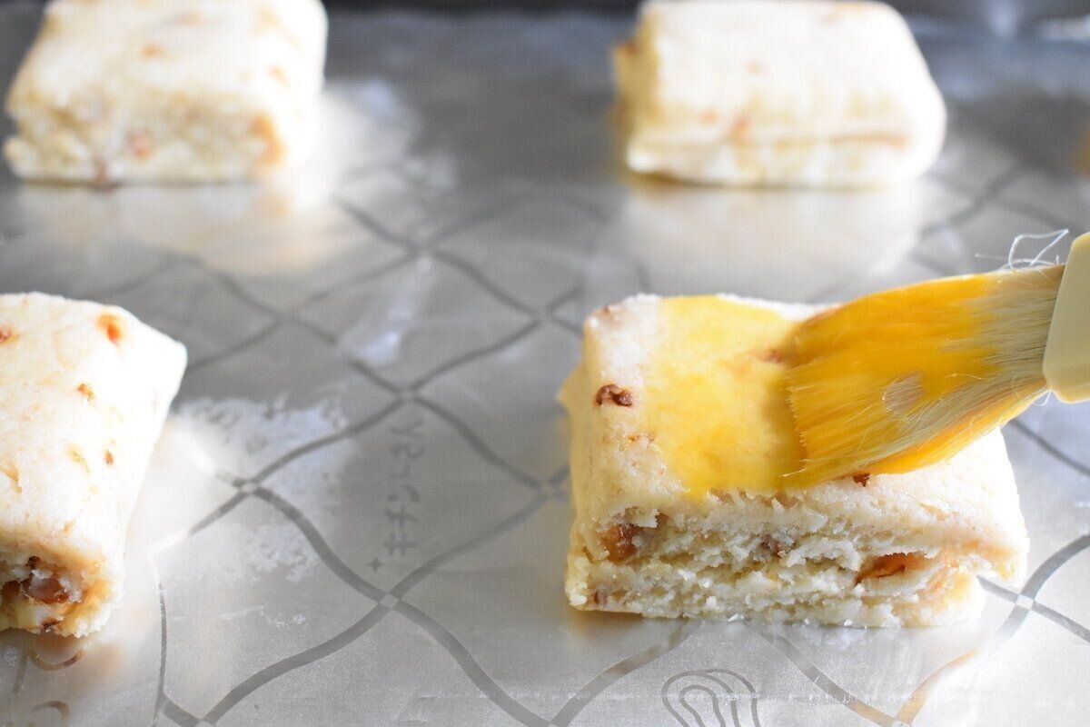 卵黄や牛乳を塗るとツヤっとおいしそうな焼き上がりに。何も塗らずに焼いても問題なし!ここは見た目の好みで選びます。