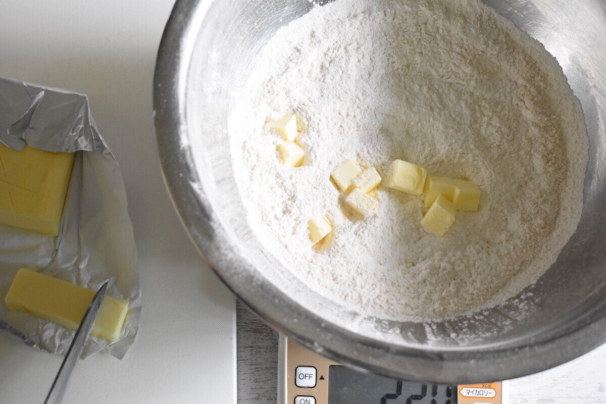 スケールを一度「0g」にリセットし、バターを角切りにしながら、少しずつ加えます。