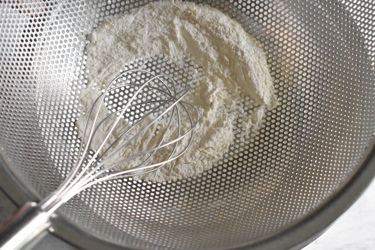 ざるを持ち、ボウルの上で、ハンドホイッパーでぐるぐる混ぜてふるいます。