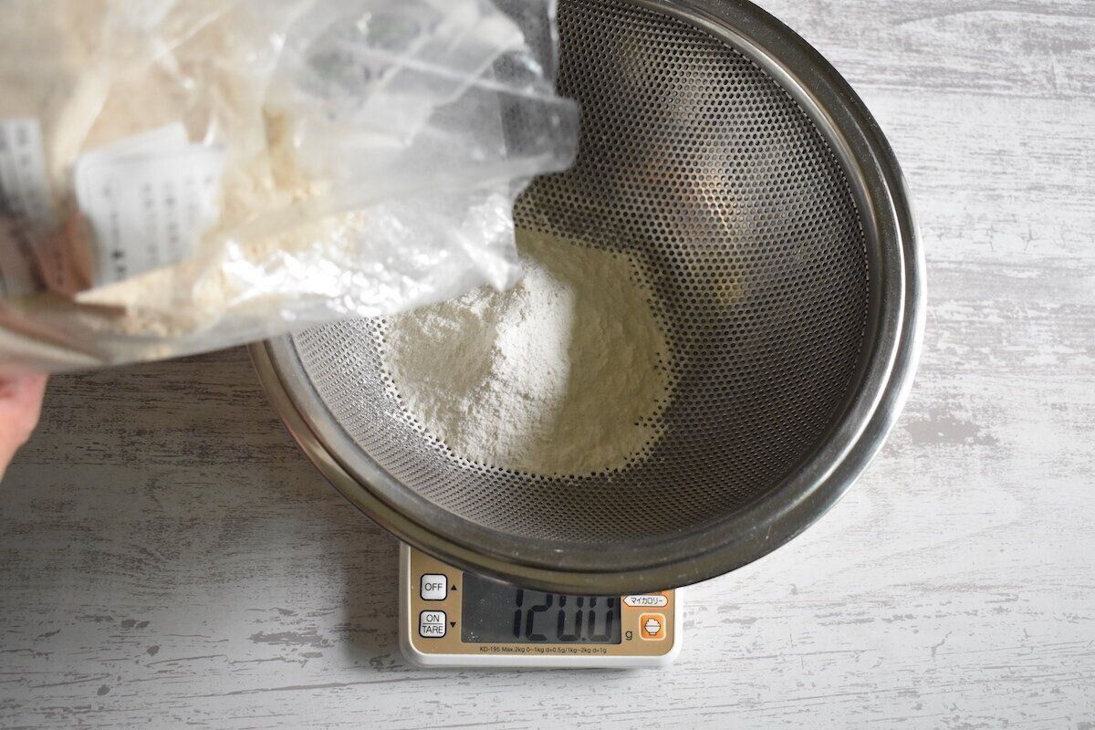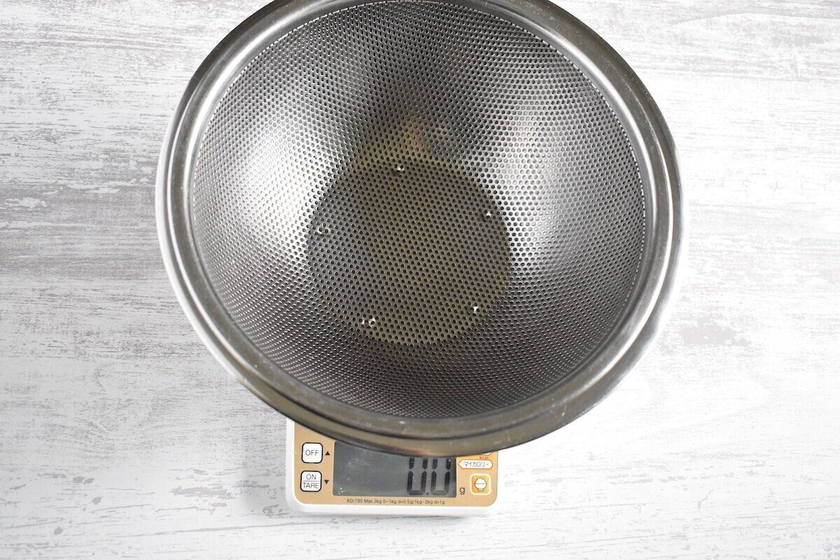 タイトルと写真のとおり。今回はボウルにざるを重ねて、キッチンスケールの上にスタンバイ。