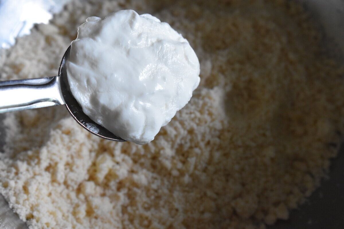 ここにヨーグルト加え、ヘラでざっくり混ぜたら、手で大きく(できるだけ少ない回数で)混ぜ、まとまりを出します。