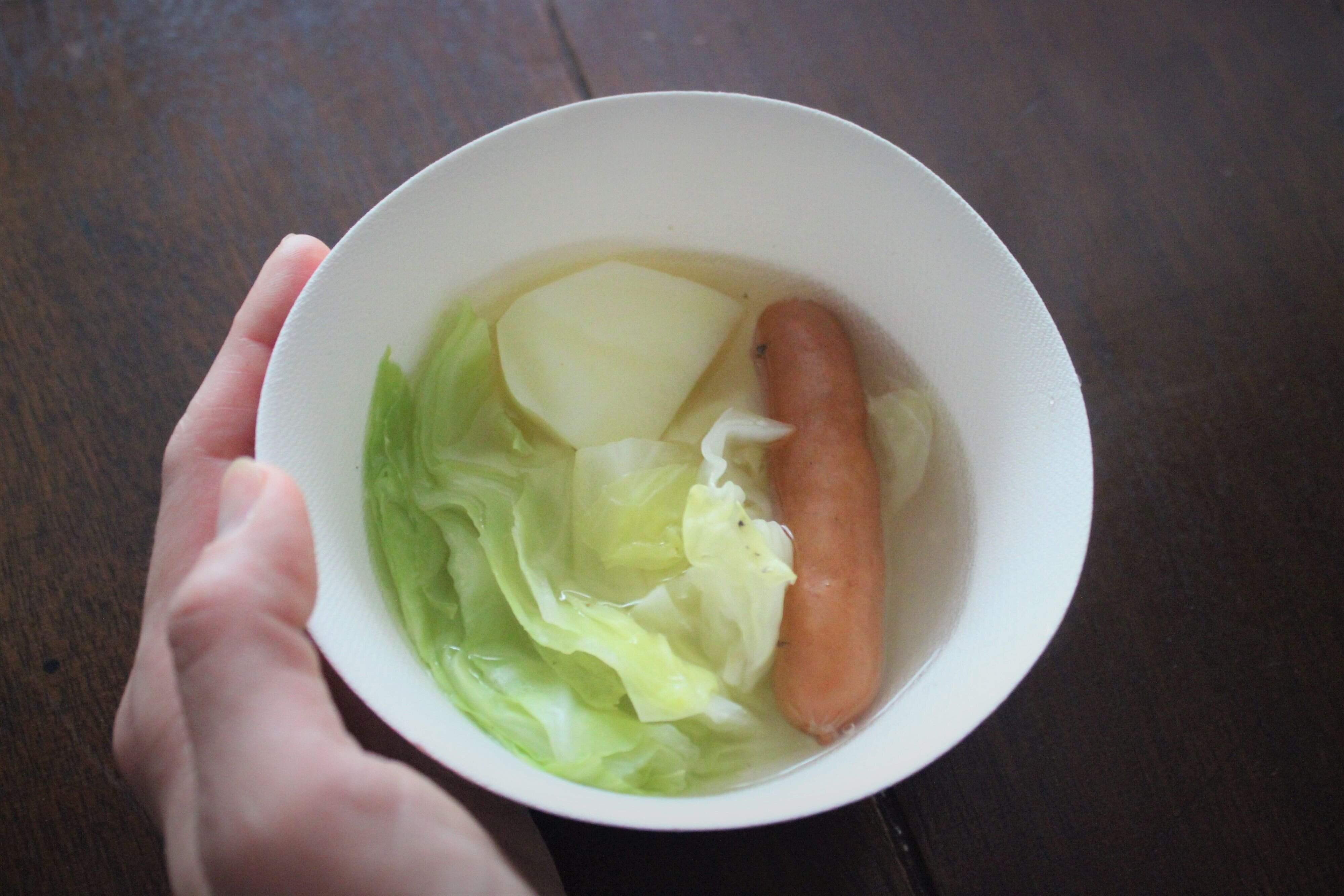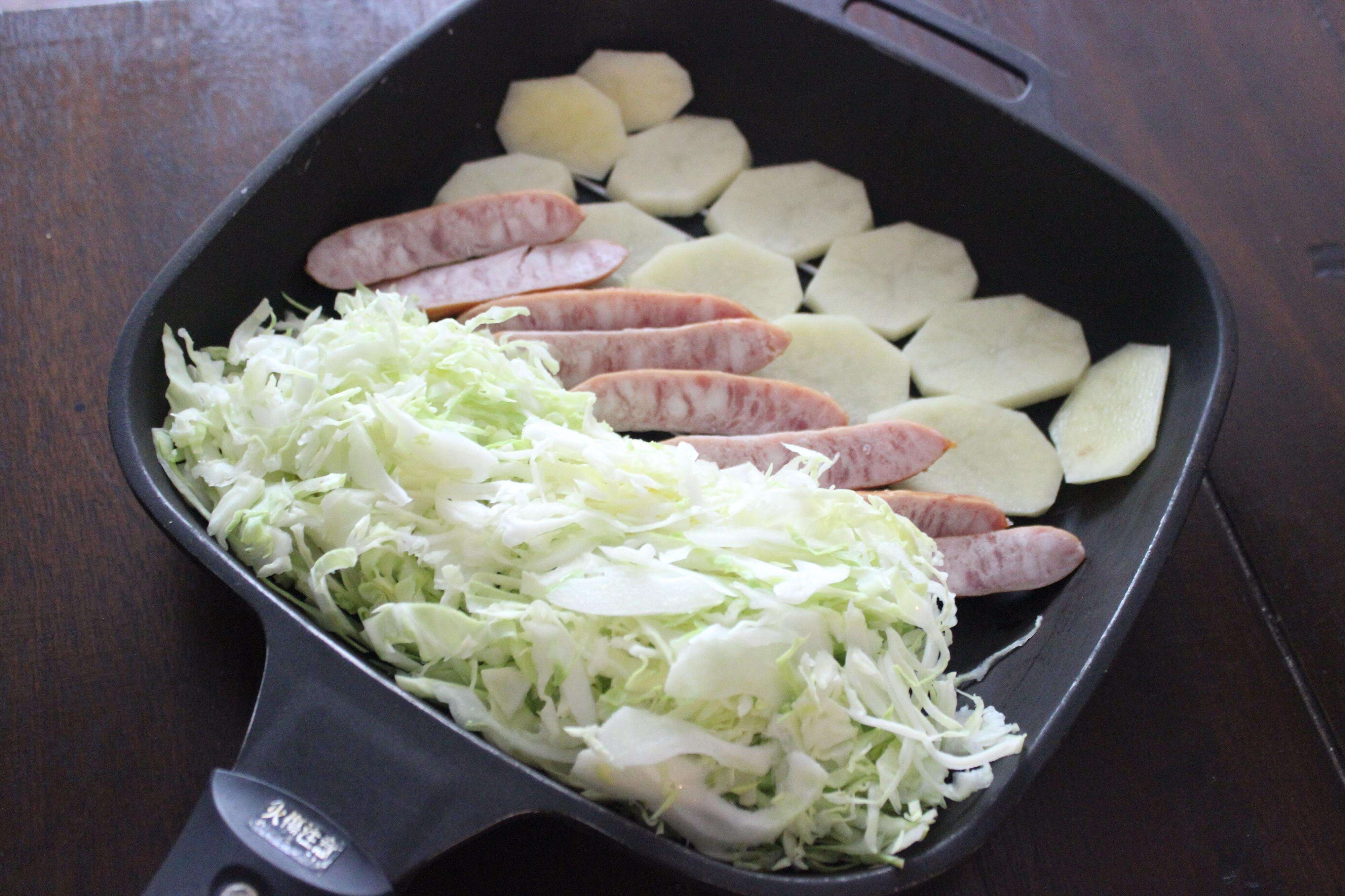 1.じゃがいも、キャベツ、ソーセージは千切りにする。