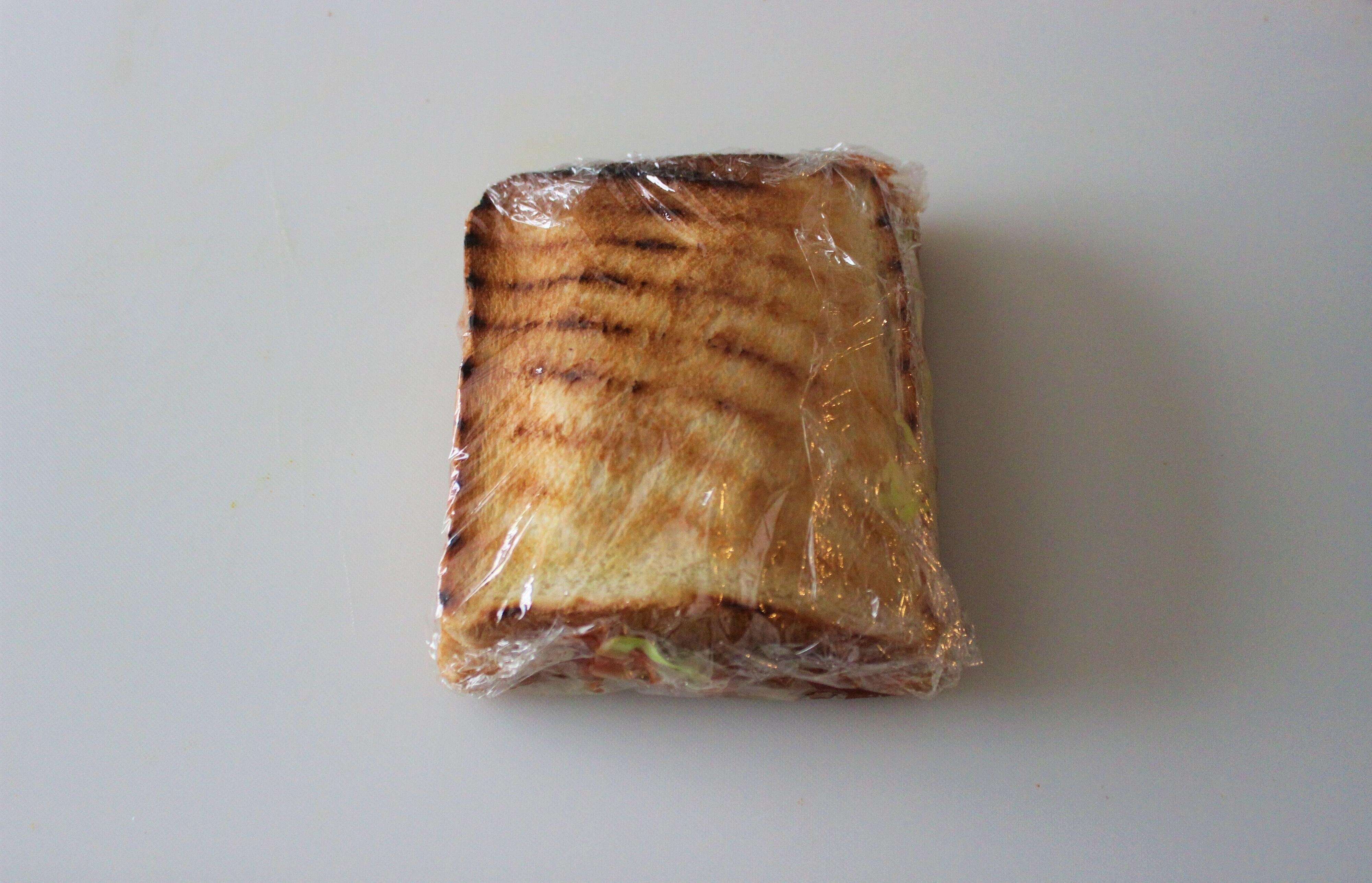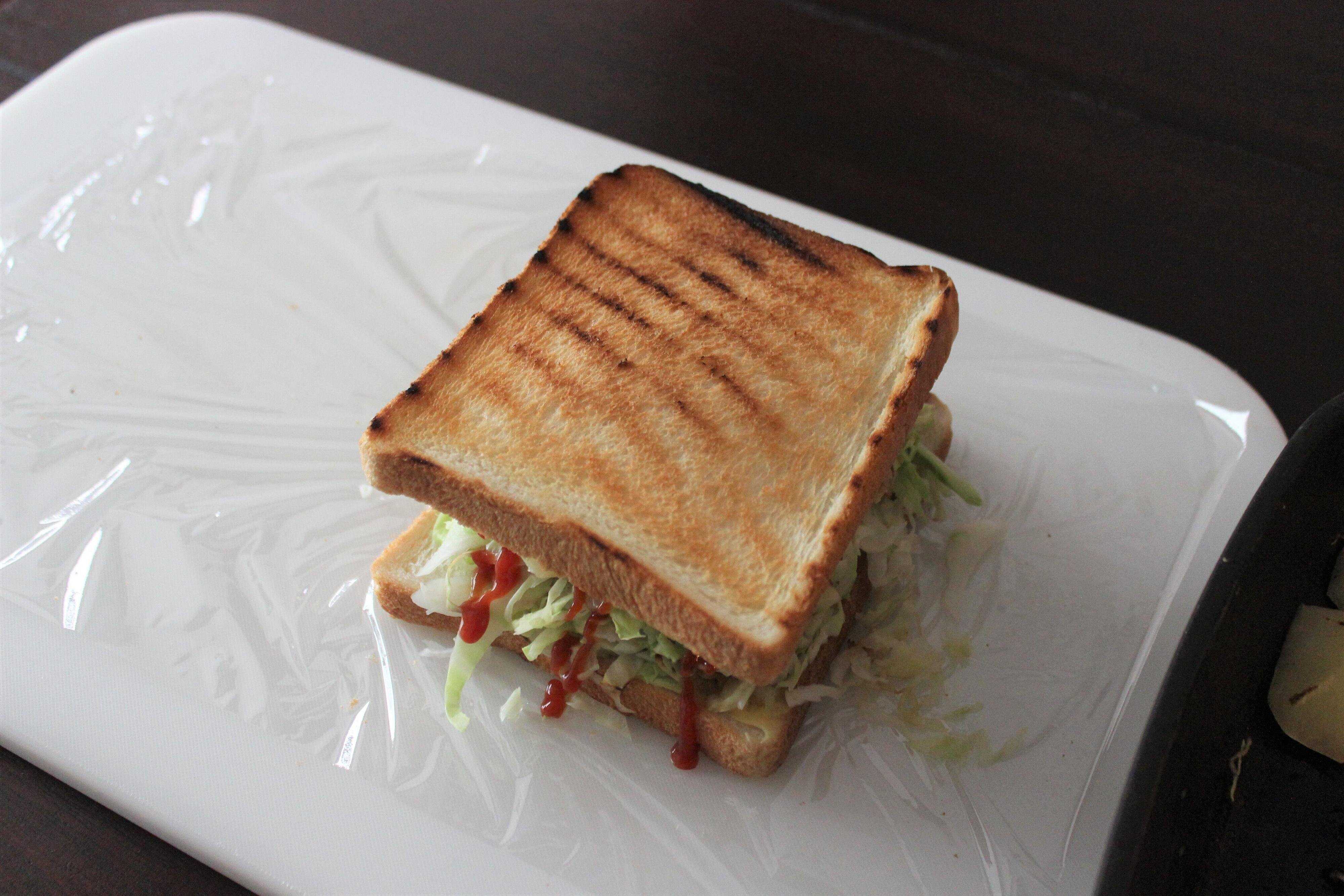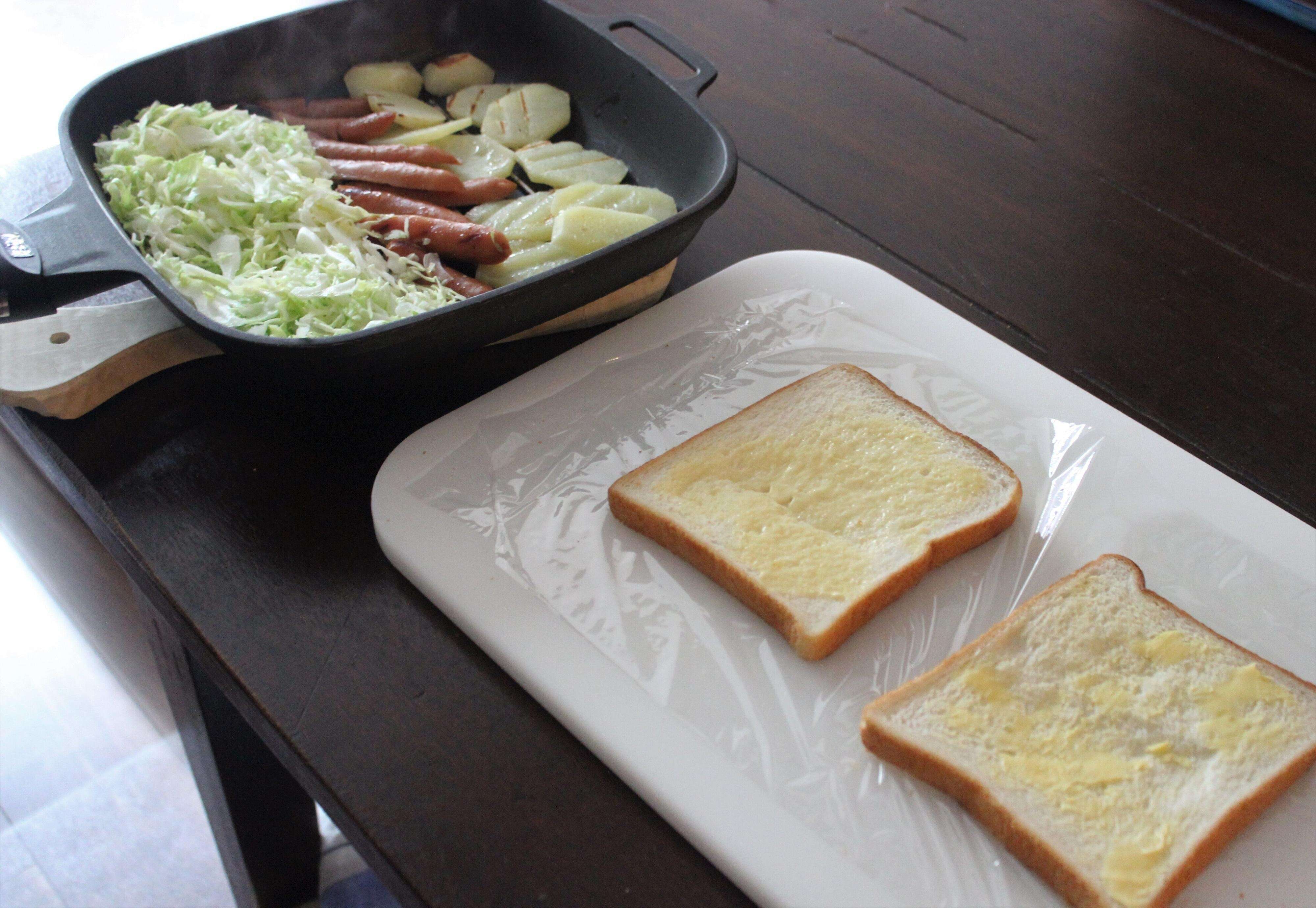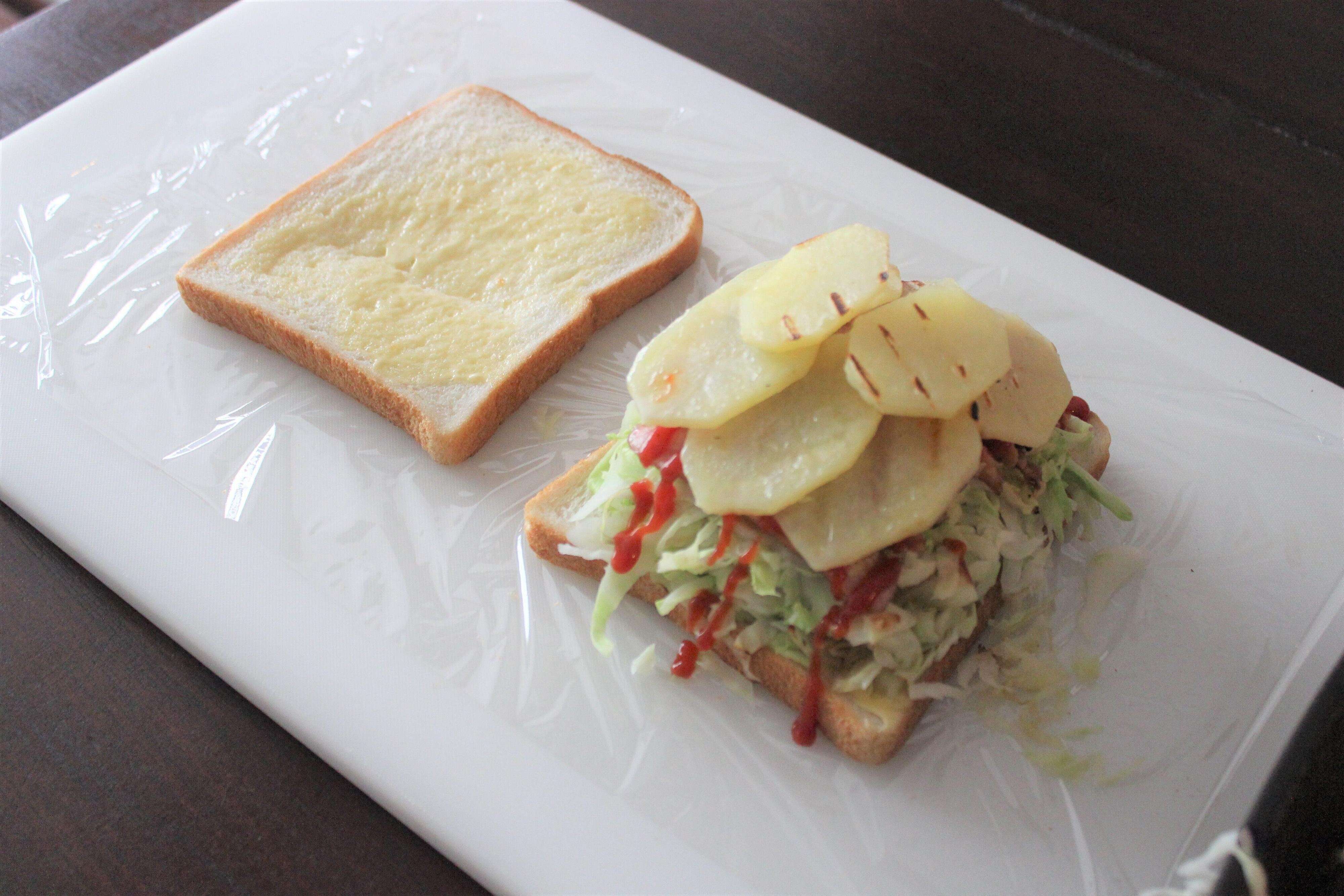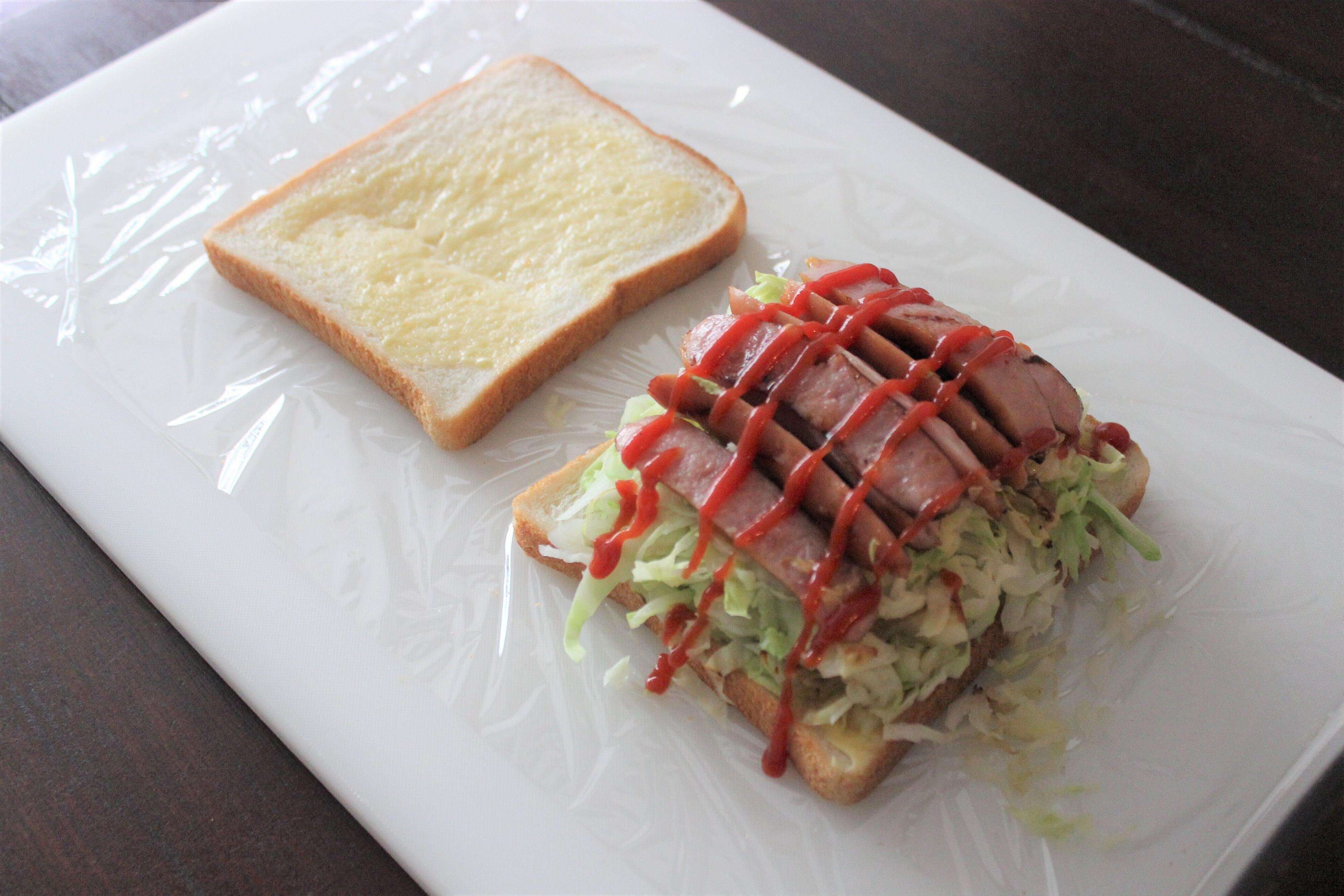 4.サランラップを広げて食パンを並べる。バターを塗った食パンにキャベツ、ソーセージを乗せ、ケチャップをかける。さらにじゃがいもを乗せ、もう1枚の食パンではさむ。