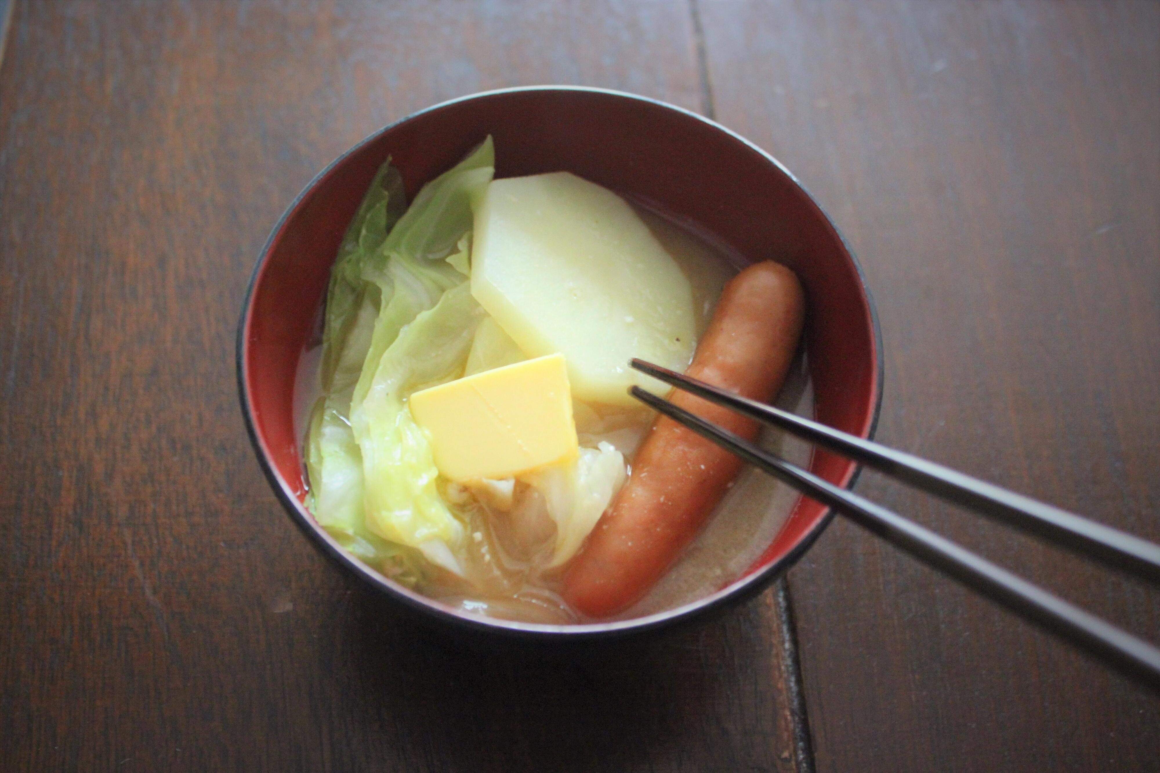 ポトフのイメージが強いソーセージですが、おみそ汁の具にしてもおいしく食べられます!食べる直前にバターをちょっとたせば、こっくりとして満足感のあるおみそ汁に。ごはんにもパンにも合う洋風みそ汁、おすすめです!