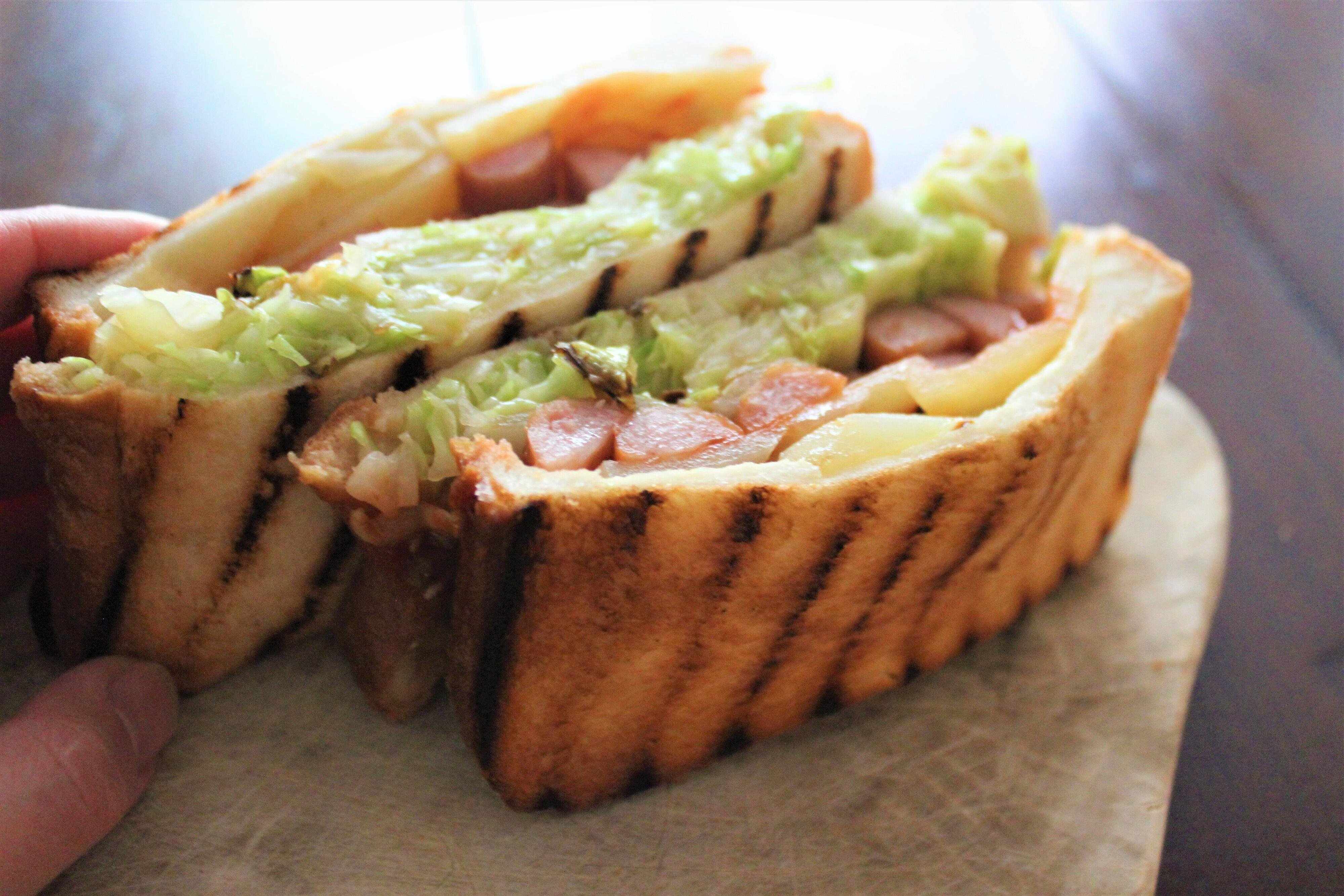 キャベツをたっぷりはさんだボリューム満点のサンドイッチです。材料をすべて1つのフライパンで同時に加熱するので手間がかからず、火を通すことでキャベツもたっぷりと食べられます。