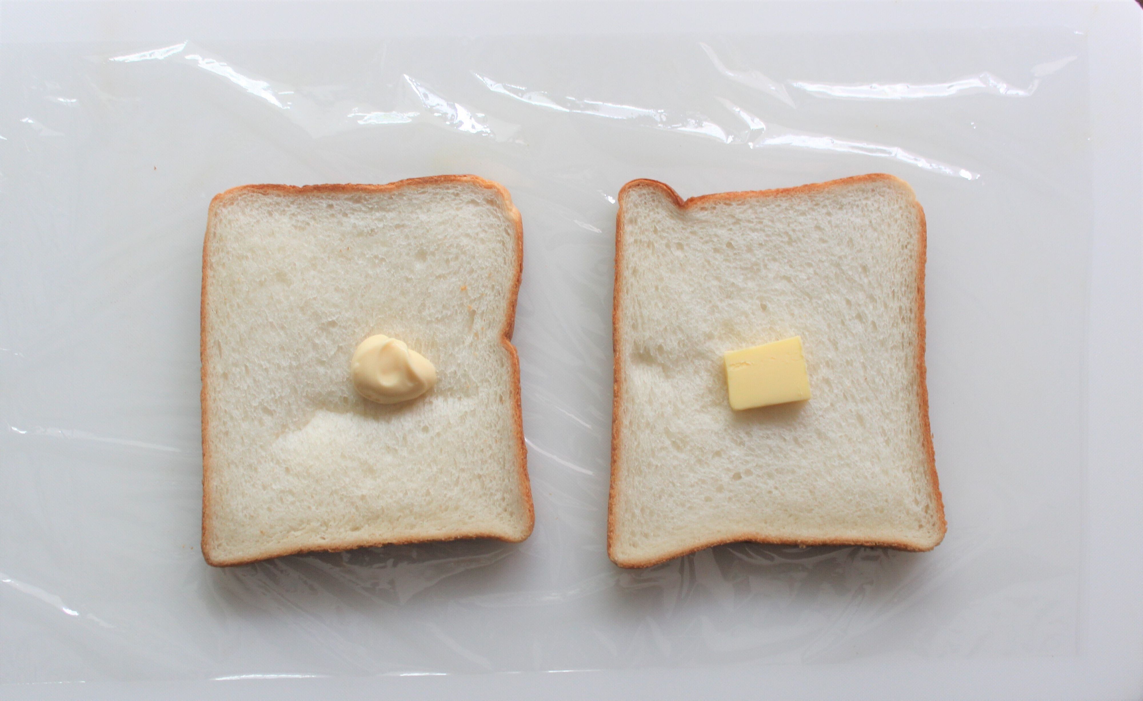 1.食パン2枚をトーストし、1枚の片面にバターを、もう1枚の片面にマヨネーズを塗る。(粒マスタードを使う場合はバターの上に塗る)