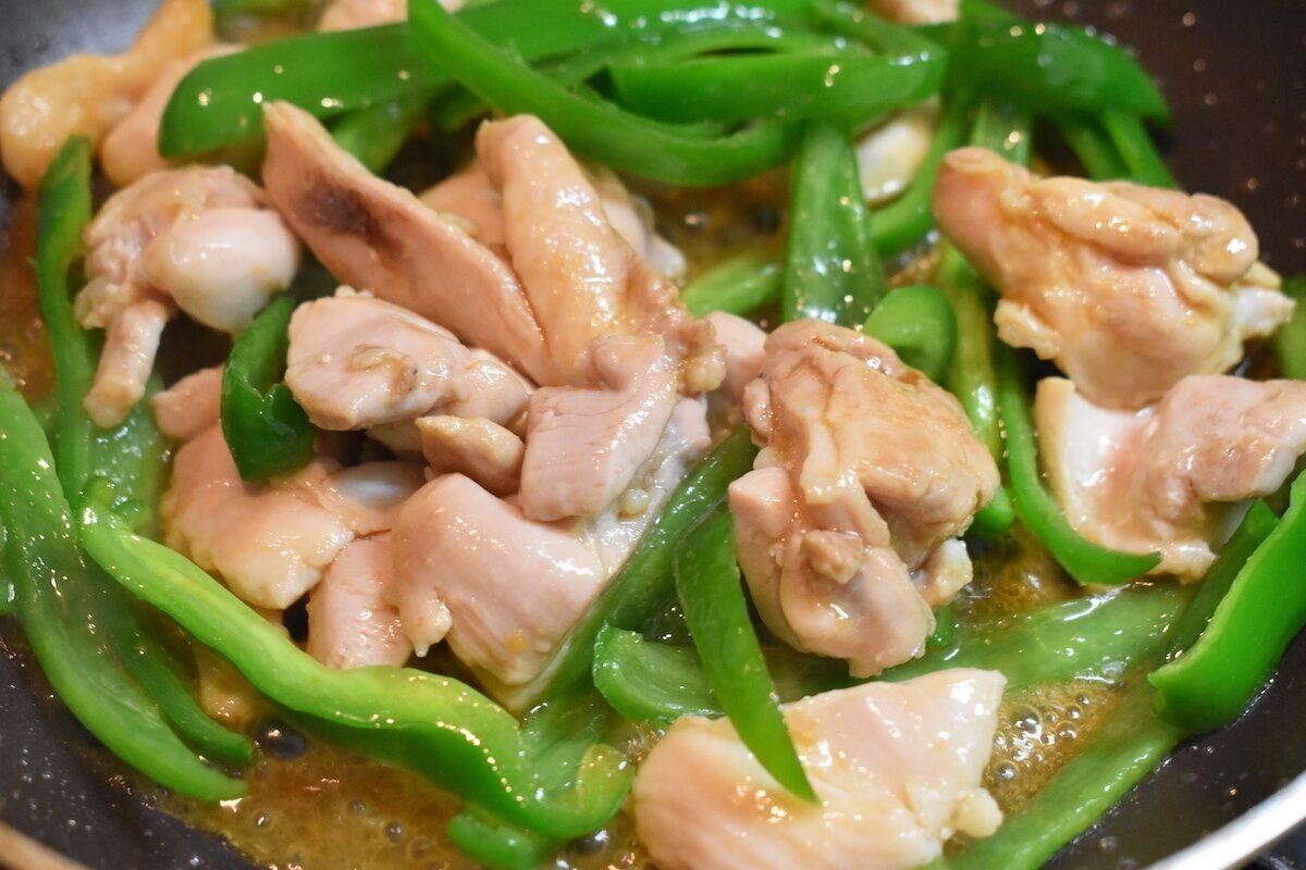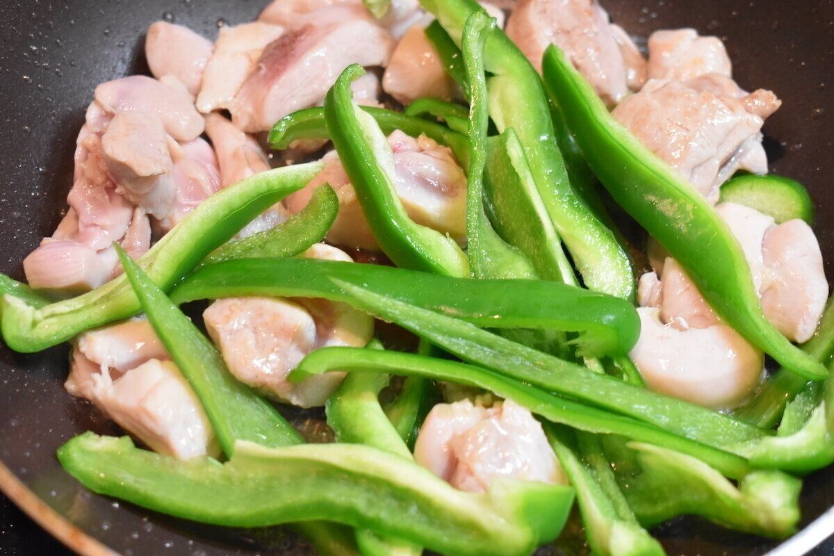 フライパンに油(小さじ1)を熱し、食べやすい大きさに切った鶏肉(もも、むねは好みでOK)を炒める。