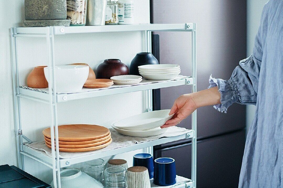 お気に入りの皿や、毎日使うご飯茶碗、お椀などは、オープンラックに置くのがマキさん流。「拭き残した水分が少し残っていてもオープンラックなら湿気がこもりません。すぐに手に取れるし、一石二鳥なんです」(マキさん)。