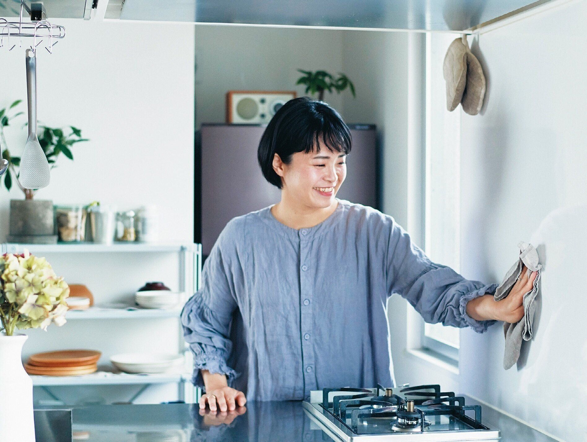 調理中の油が飛びやすいガス台まわりの壁は、使うたびにささっと拭き掃除。「油汚れはほうっておくと頑固な汚れに変化します。調理後なら、ふきんでさっと拭くだけで簡単に落ちます」(マキさん)。汚れは「ためずに除去」が鉄則。
