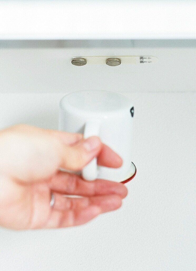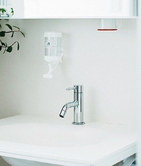 「ディスペンサーやコップの下は汚れや水分がたまってぬめりがち。洗面台には物を置かずに浮かせて収納しています」(マキさん)。洗面台上の収納棚にマグネットをつければ浮かせる収納が完成。汚れを増やさないアイデアは秀逸。