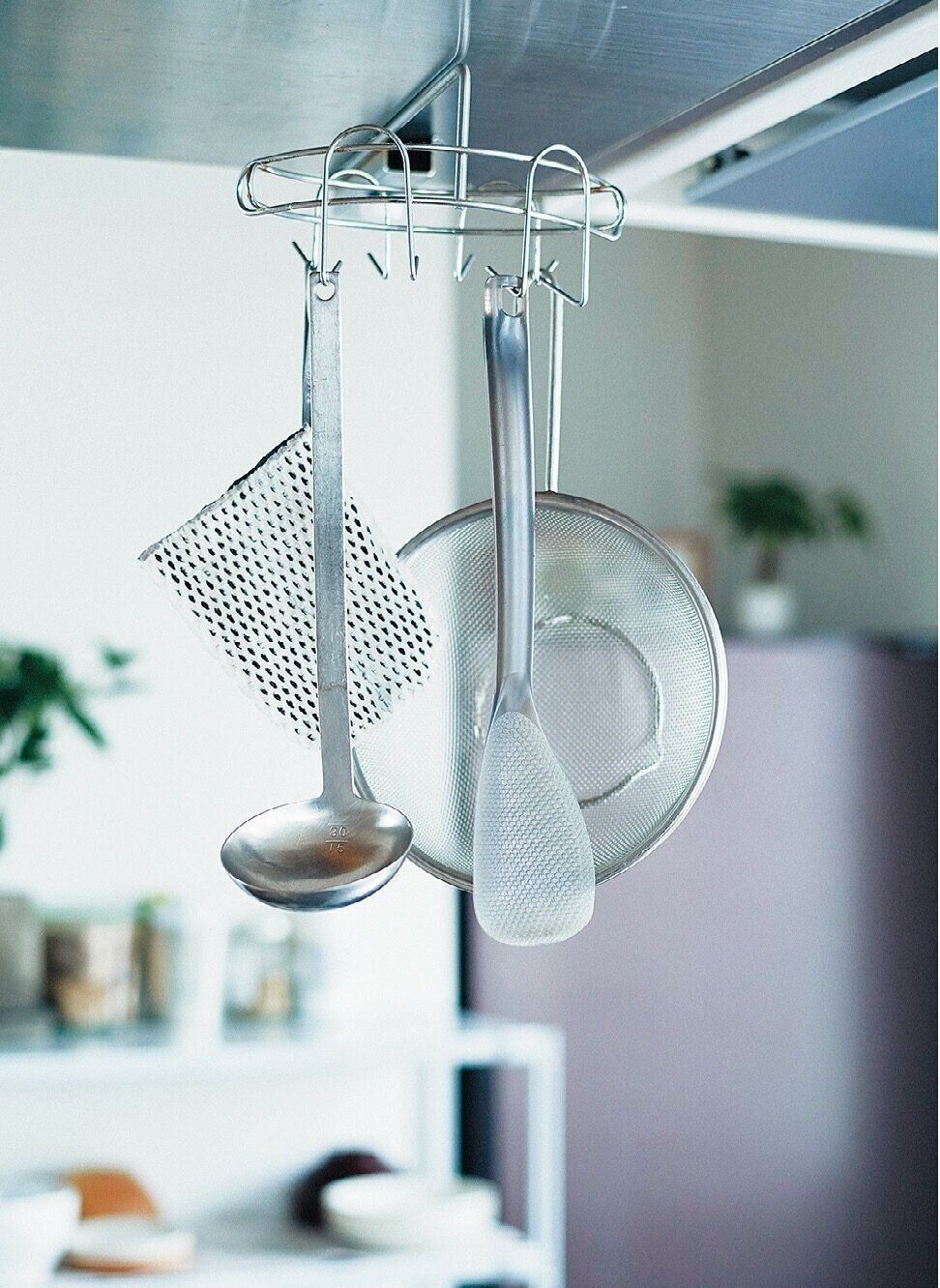 ざるやへらなどは、引き出しやシンク下の扉などにしまい込まずに、つるして収納。拭き残した水分がこもることがないから、いつでもカラッと乾燥状態に。「目の細かいざるもさっと拭くだけだからラクチンです」(マキさん)。