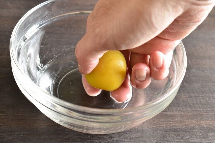 個人的には小さめのボウル2つに焼酎、平皿にあら塩を少量のせ、まずボウル1に梅をくぐらせ、あら塩をほんの少量まぶし、再びボウル1の中で梅をやさしく洗います。