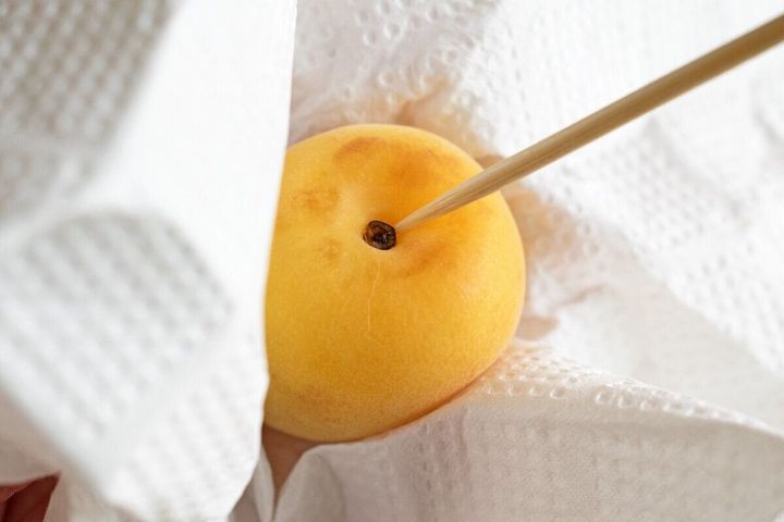梅漬けする前の最終確認です。このときに竹串で梅に傷がつくとカビの原因になることもあるので、やさしく作業をしてください。もともと傷や腐敗がありそうな場合は取り除きましょう。