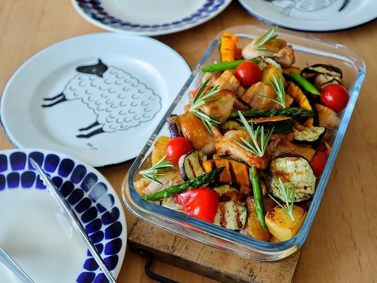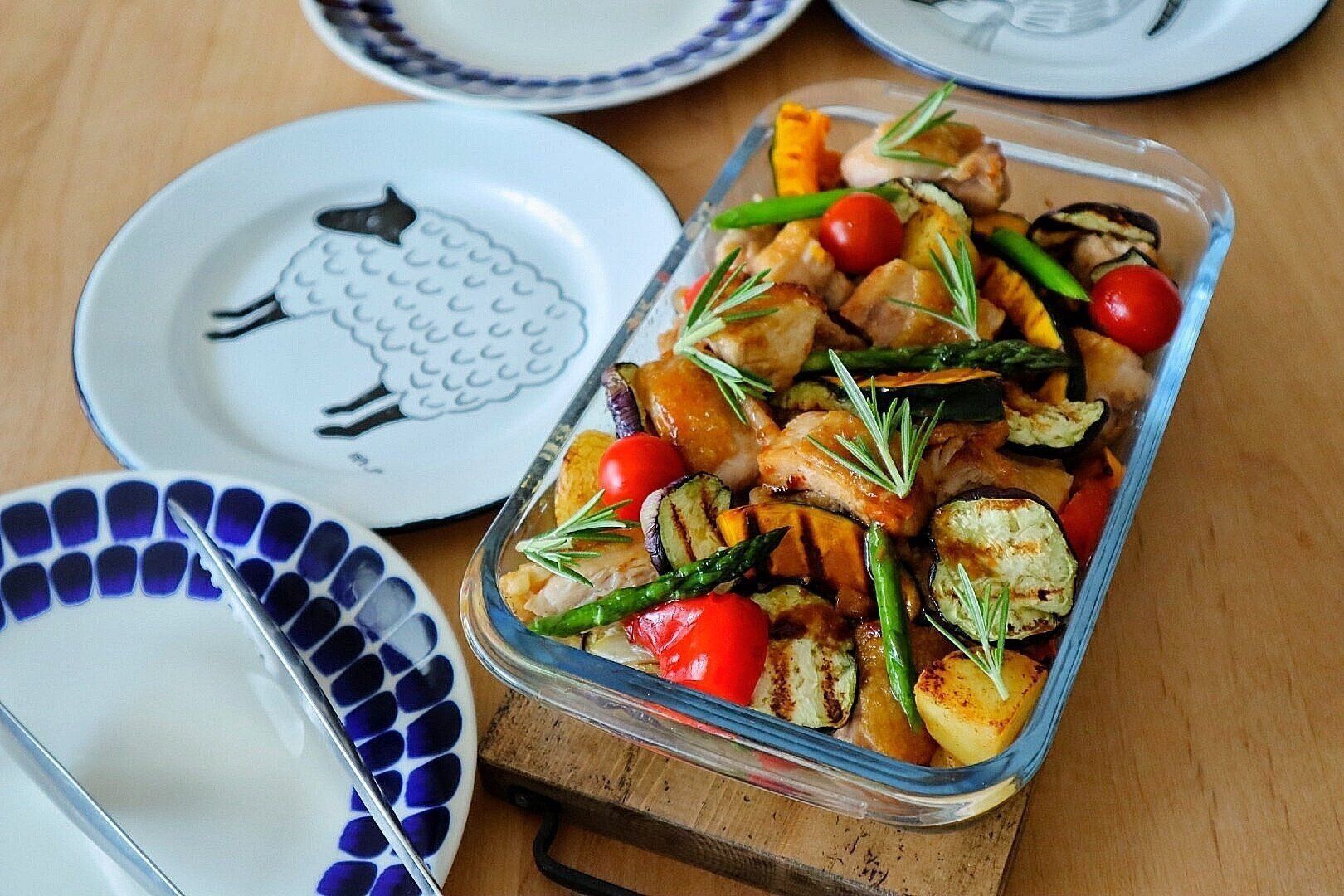 5.鶏肉を一口大に切り、野菜といっしょに耐熱容器にぎゅうぎゅうに詰め、お好みでローズマリーなどのハーブをのせる