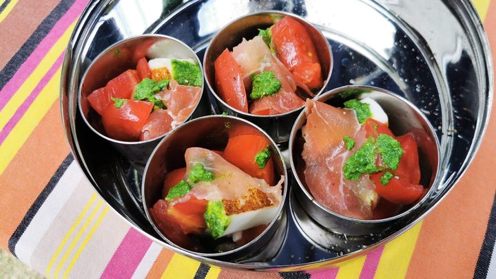 そんなときには切ったトマトに、軽く焼いたはんぺん、生ハムをあわせ、最後に市販のジェノベーゼソースをちょこっとのせると、あっという間に手の込んだ風、副菜が完成します。