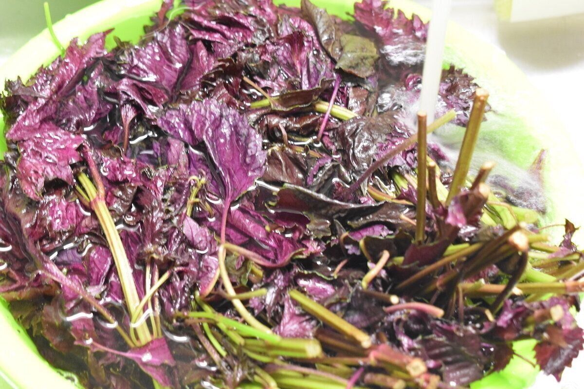 1:赤じそを洗う