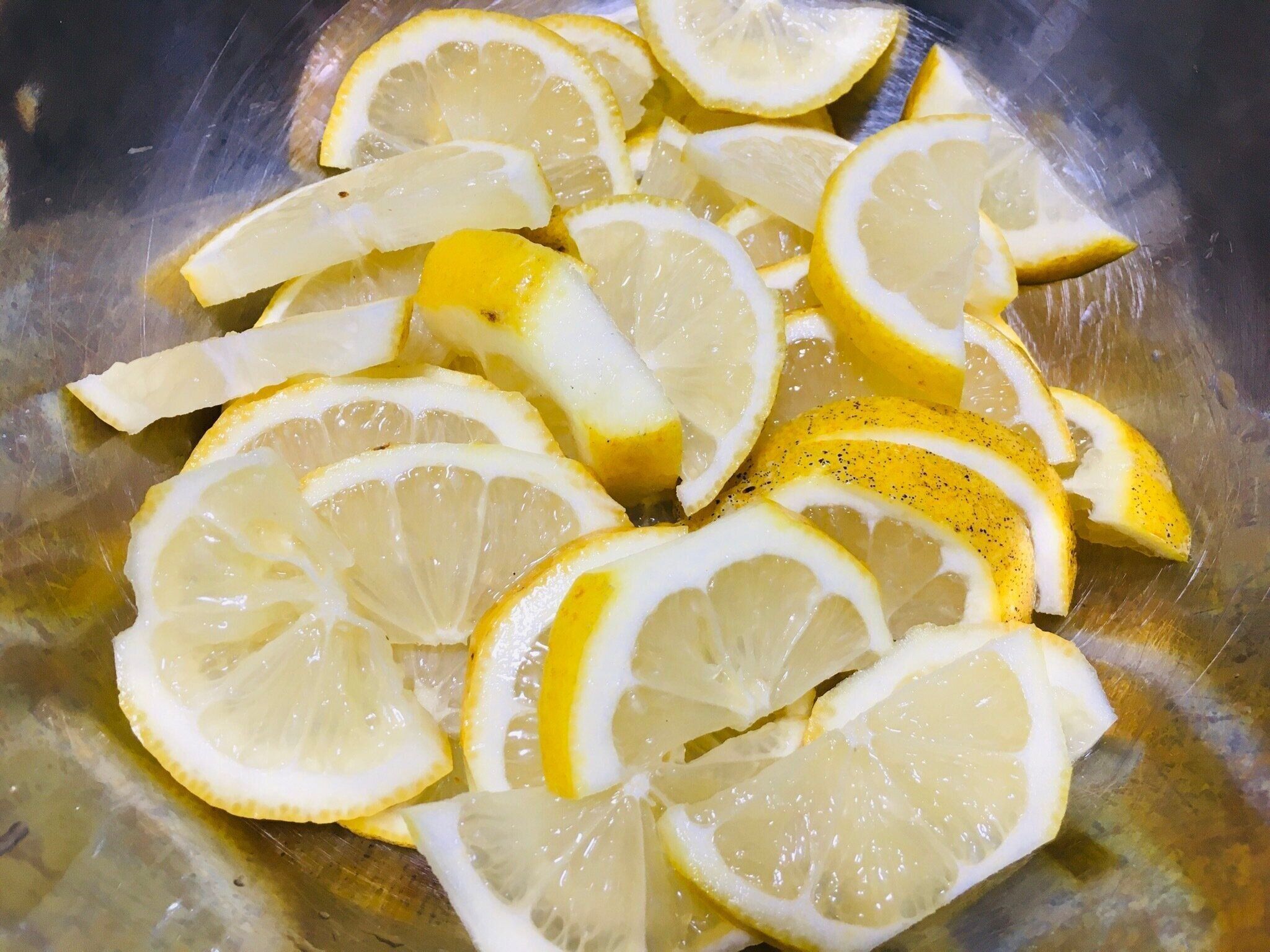 1.レモンはよく洗い、5mm程度のいちょう切りにする。種は取っておくと飲むとき口に残りません。